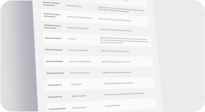 TABLE B.1 Structure of the Global Gender Gap Index Subindex Indicator Source Economic Participation Labour-force participation rate International Labour Organization (ILO), ILOSTAT database, Labour Force Surveys. and Opportunity Economic Participation Wage equality for similar work World Economic Forum, Executive Opinion Survey (EOS). and Opportunity Economic Participation Estimated earned income International Labour Organization (ILO), ILOSTAT database; World Population Prospects and Opportunity 2022; World Bank, World Development Indicators database. Economic Participation Legislators, senior officials and managers International Labour Organization (ILO), ILOSTAT database. and Opportunity Economic Participation Professional and technical workers International Labour Organization (ILO), ILOSTAT database. and Opportunity UNESCO, UIS.Stat Education statistics data portal. When not available, data is sourced Educational Attainment Literacy rate from United Nations Development Programme, Human Development Reports, most recent year available between 2013 and 2023. Educational Attainment Enrolment in primary education UNESCO, UIS.Stat Education statistics data portal. Educational Attainment Enrolment in secondary education UNESCO, UIS.Stat Education statistics data portal. Educational Attainment Enrolment in tertiary education UNESCO, UIS.Stat Education statistics data portal. Health and Survival Sex ratio at birth World Bank, World Development Indicators database. Health and Survival Healthy life expectancy World Health Organization (WHO), Global Health Observatory database. Political Empowerment Women in parliament Inter-parliamentary Union. Political Empowerment Women in ministerial positions Inter-parliamentary Union-UN Women. Political Empowerment Years with female/male head of state (last 50) World Economic Forum’s calculations. Source World Economic Forum, Global Gender Gap Index 2023. Global Gender Gap Report 2023 63