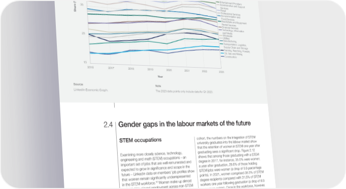 FIGURE 2.10 Share of women hired into senior leadership, by industry, 2016-2023 55 Hospitals and Health Care Consumer Services Education 45 Government Administration Entertainment Providers Administrative and Support Services Retail Professional Services e (%)35 Accommodation and Food Services Shar Real Estate and Equipment Rental Services Financial Services Technology, Information and Media Wholesale Utilities 25 Manufacturing Transportation, Logistics, Supply Chain and Storage Farming, Ranching, Forestry Oil, Gas and Mining Construction 15 2016 2017 2018 2019 2020 2021 2022 2023 Year Source Note LinkedIn Economic Graph. The 2023 data points only include data for Q1 2023. 2.4 Gender gaps in the labour markets of the future STEM occupations cohort, the numbers on the integration of STEM university graduates into the labour market show that the retention of women in STEM one year after Examining more closely science, technology, graduating sees a signi昀椀cant drop. Figure 2.12 engineering and math (STEM) occupations – an shows that among those graduating with a STEM important set of jobs that are well remunerated and degree in 2017, for instance, 35.5% were women; expected to grow in signi昀椀cance and scope in the a year after graduation, 29.6% of those holding future – LinkedIn data on members’ job pro昀椀les show STEM jobs were women (a drop of 5.9 percentage that women remain signi昀椀cantly underrepresented points). In 2021, women comprised 38.5% of STEM 16 in the STEM workforce. Women make up almost degree recipients compared with 31.6% of STEM half (49.3%) of total employment across non-STEM workers one year following graduation (a drop of 6.9 occupations, but just 29.2% of all STEM workers percentage points). Once in the workforce, however, (Figure 2.11). The fraction of women in STEM jobs women are generally less likely to drop out in the has nonetheless grown by 1.58 percentage points 昀椀rst years (until they start climbing the hierarchy, see from 27.6% in 2015, and the growth outpaces that Figure 2.12). For example, the difference between for non-STEM jobs (0.37 percentage points). year 2 after graduation and year 1 after graduation is around 1 or 2 percentage points. This data from LinkedIn suggests that one 昀椀rst point of intervention in improving numbers could be to When it comes to STEM occupations, women smooth the transition for female STEM graduates are scarce throughout all industries, apart from from university to the world of work. While the Healthcare and Care Services, where they represent percentage of female STEM graduates entering 51.5% of the workforce. Gender parity in STEM into STEM employment is increasing with every jobs across industries varies widely. In Technology, Global Gender Gap Report 2023 44