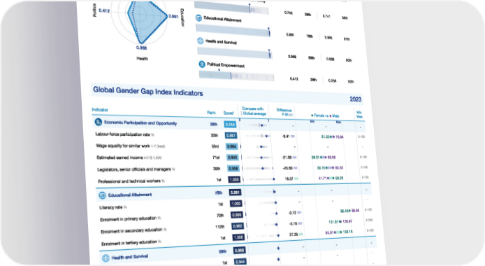 Economy Profile Score Rank Index Edition (imparity = 0, parity = 1) (out of 146 countries) Australia 0.778 26th 2023 Global Gender Gap Index 2023 Edition Overview 2023 2022 Australia score Index and Subindex Score Rank Score Rank average score Economy Global Gender Gap Index 0.778 26th 0.738 43rd 0.740 Economic Participation and Opportunity 0.740 38th 0.741 38th E d s u c c i Educational Attainment t a i 0.412 0.991 l t i o o P n 0.991 78th 0.985 87th Health and Survival 0.968 89th 0.968 90th 0.968 Health Political Empowerment 0.412 29th 0.258 50th Global Gender Gap Index Indicators 2023 Compare with Difference Min Global average Indicator Rank Score* F-M Female vs Male Max 0 1 Min Max Economic Participation and Opportunity 38th 0.740 - - - 0-100 Labour-force participation rate % 30th 0.867 -9.41 61.23 70.64 - Wage equality for similar work 1-7 (best) 53rd 0.664 - - 0-150 Estimated earned income int'l $ 1,000 71st 0.643 -21.69 39.01 60.69 0-100 Legislators, senior officials and managers % 39th 0.658 -20.60 39.70 60.30 0-100 Professional and technical workers % 1st 1.000 16.57 41.71 58.29 Educational Attainment 78th 0.991 - - - - Literacy rate % 1st 1.000 - - 0-100 Enrolment in primary education % 70th 0.999 -0.12 98.48 98.60 0-200 Enrolment in secondary education % 112th 0.962 -5.16 131.81 136.97 0-200 Enrolment in tertiary education % 1st 1.000 37.25 95.91 133.16 Health and Survival 89th 0.968 - - - - Sex ratio at birth** % 1st 0.944 - - - Healthy life expectancy** years 98th 1.023 - - Political Empowerment 29th 0.412 - - - 0-100 Women in parliament % 31st 0.623 -23.20 38.40 61.60 0-100 Women in ministerial positions % 19th 0.769 -13.04 43.48 56.52 0-50 Years with female/male head of state (last 50) 46th 0.064 -43.98 3.01 46.99 Global Gender Gap Report 2023 93