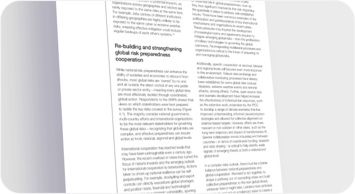 shared responsibility between sectors, with local landscape, leading to spiralling distrust, declining and national governments, business and civil society safeguards against mutually assured economic each playing to their strengths, rather than traditional destruction, and currency and technological tools models of governments addressing market failures that are less in昀氀uential. Even areas traditionally 8 when they occur. For example, private-public open to collaboration, such as international climate partnerships can help close key gaps in innovation, research, are under threat. For example, data 昀椀nancing, governance and implementation of regarding Russia’s boreal forests –the biggest land- preparedness measures for emerging and well- based carbon store on the planet – is no longer established risks, such as food and water insecurity, available for international scienti昀椀c research because 11 weakened education and healthcare systems, and of the war in Ukraine. insuf昀椀cient regulation of dual-use technologies, or addressing the looming insurance gap relating to International organizations will continue to play 9 cyberwarfare. Innovative collaborations can also an essential role in global preparedness, even as minimize overall exposure to potential impacts, as they face signi昀椀cant headwinds that risk degrading organizations across geographies and sectors are the guardrails in place to address well-established rarely exposed to the same risks at the same time. issues. There have been numerous examples of the For example, data centres of different institutions politicization and partial paralysis of key international in differing geographies are highly unlikely to be mechanisms and organizations in recent crises. exposed to the same cyber or extreme weather These pressures may impede the development risks, meaning effective mitigation could include of meaningful norms and agreements required to regular backups of each other’s systems.10 mitigate emerging global risks – from the proliferation of military technologies to governing the global commons. Re-invigorating multilateral processes and Re-building and strengthening organizations is critical to the future of preparing for global risk preparedness and managing global risks. cooperation Additionally, speci昀椀c cooperation at sectoral, bilateral and regional levels will become even more important While national risk preparedness can enhance the in this environment. Robust data exchange and ability of societies and economies to rebound from collaborative monitoring processes have already shocks, most global risks are ‘owned’ by no one been established for some global risks (natural and sit outside the direct control of any one public disasters, extreme weather events and terrorist or private sector entity – meaning many global risks attacks, among others). Further, open-source data are most effectively tackled through coordinated, and scenario development have helped increase global action. Respondents to the GRPS shared their the effectiveness of individual risk responses, such views on which stakeholders were best prepared as the extensive work undertaken by the IPCC to tackle the key risks covered in the survey (Figure to develop a range of climate scenarios that has 4.1). The majority consider national governments, improved understanding, informed decarbonization multi-country efforts and international organizations strategies and allowed for collective alignment on to be the most relevant stakeholders for governing science-based targets. However, efforts are more these global risks – recognizing that global risks are nascent or non-existent in other areas, such as the complex, and effective preparedness can require long-term trajectory and impact of transformative AI. action at local, national, regional and global levels. Greater collaboration across industries and between countries – in terms of coordinated funding, research International cooperation has reached levels that and data sharing – is critical to help identify weak may have been unimaginable even a century ago. signals of emerging threats at both a national and However, the recent overload of crises has turned the global level. focus of nations inwards and the emerging outlook for international cooperation is deteriorating. Actions In a complex risks outlook, there must be a better taken to shore up national resilience can be self- balance between national preparedness and perpetuating. For example, stockpiling and export global cooperation. We need to act together, to controls can directly exacerbate global shortages shape a pathway out of cascading crises and build and position trade, 昀椀nancial and technological collective preparedness to the next global shock, dependencies as a strategic vulnerability, spurring whatever form it might take. Leaders must embrace further disintegration. Similarly, the pursuit of complexity and act on a balanced vision to create a domestic and global security goals may have stronger, prosperous shared future. unintended consequences for the geopolitical Global Risks Report 2023 72