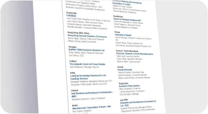 Germany Shulette Cox, Vice President, Research, Advocacy, Institute for Innovation and Technology within the and Project Implementation VDI/VDE Innovation + Technik GmbH National Competitiveness Council Jamaica Michael Nerger, Project Leader Sharifa Powell, Consultant Project Manager Ghana Japan Association of Ghana Industries Waseda University Yaw Adu-Gyam昀椀, President Jusuke Ikegami, Professor Seth Twum-Akwaboah, Chief Executive Of昀椀cer Mitsuyo Tsubayama, Coordinator John Defor, Direcctor, Policy and Research Shoko Miya, Coordinator Greece Jordan SEV Hellenic Federation of Enterprises Ministry of Planning and International Michael Mitsopoulos, Director - Business Cooperation of Jordan Environment and Regulatory Affairs Hadram Al Fayes, Director Athanasios Printsipas, Senior Advisor - SEV Ghada Issa, Head of Competitiveness Division Business Council for Sustainable Development Thamer Masarweh, Researcher Guatemala Kazakhstan FUNDESA Center for Strategic Initiatives LPP Juan Carlos Paiz, President of the Board of Directors Olzhas Khudaibergenov, Senior Partner Juan Carlos Zapata, Chief Executive Of昀椀cer Yerbol Tulegenov, Associate Partner Fernando Spross, Associate Researcher Symbat Aliaskarova, Consultant Priscilla González, Corporate Affairs Coordinator Kenya Hong Kong SAR, China University of Nairobi Hong Kong General Chamber of Commerce Karuti Kanyinga, Research Professor and Director, Simon Ngan, Director, Policy and Research IDS Wilson Chong, Senior Economist Vincent Mugo, Project Assistant IDS Paul Kamau, Associate Research Professor, IDS Hungary KOPINT-TÁRKI Economic Research Ltd Kosovo*, North Macedonia Peter Vakhal, Senior Research Associate Economic Chamber of North-West Macedonia Éva Palócz, CEO Drilon Iseni, Executive Director Durim Zekiri, Operations Manager Iceland Miranda Ajdini, Legal associate The Icelandic Centre for Future Studies Karl Friðriksson, Manager Director Kuwait Kuwait University India Fahad Al-Rashid, Committee Chair LeadCap Knowledge Solutions Pvt Ltd - Adel Al-Husainan, Committee Member LeadCap Ventures Majed Jamal Al-Deen, Committee Member Sangeeth Varghese, Managing Director and CEO Vidyadhar Prabhudesai, Director and COO Kyrgyzstan Economic Policy Institute Ireland Marat Tazabekov, Chairman Irish Business and Employers Confederation - Lola Abduhametova, Coordinator IBEC Irina Kandybko, Manager Geraldine Anderson, Head of Research Lao PDR Israel Enterprise and Development Consultants Co. Manufacturers' Association of Israel - MAI Ltd - EDC Ron Tomer, President Buakhai Phimmavong, Managing Partner Ruby Ginel, CEO Thipphasone Inthachack, Of昀椀ce administrator Dan Catarivas, General Manager, Foreign Trade and International Relations Division Latvia Itai Nakash, Deputy General Manager, Foreign Trade Stockholm School of Economics in Riga and International Relations Division Arnis Sauka, Head of the Centre for Sustainable Development Jamaica Mona School of Business and Management - Lesotho MSBM, The University of the West Indies, Mona Private Sector Foundation of Lesotho - PSFL David McBean, Executive Director Thabo Qhesi, CEO Franklin Johnston, Director Bokang Tsoanamatsie, Public Relations Of昀椀cer Yvette Cameron-Harris, Project Administrator Qothoase Khofane, Researcher Jamaica Promotions Corporation - JAMPRO Global Risks Report 2023 92
