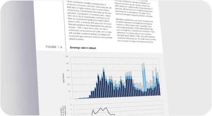 The IMF’s most recent projections anticipate a Even if the economic fallout remains comparatively decline in global in昀氀ation from almost 9% in 2022 contained, global growth is forecast to slow to to 6.5% this year and 4.1% in 2024, with a sharper 2.7% in 2023, with around one-third of the world’s 16 disin昀氀ation in advanced economies. However, economy facing a technical recession – the third- 18 downside risks to the outlook loom large. The weakest growth pro昀椀le in over 20 years. This complexity of in昀氀ationary dynamics is creating a downturn will be led by advanced markets, with challenging policy environment for both the public projected growth falling to 1.1% in 2023, while the sector and central banks, given the mix of demand largest economies – the EU, China and the United and supply-side drivers, including a prolonged war States of America – face continued challenges to in Ukraine and associated energy-supply crunch, growth. However, for developing economies, there potential for escalating sanctions, and continued is a risk of further economic distress and tougher bottlenecks from a lingering pandemic or new trade-offs. Stubbornly high in昀氀ation and more sources of supply-side controls. disorderly containment will raise the likelihood of stagnant economic growth, liquidity shocks and Given currently low headline unemployment in debt distress on a global scale. Energy importers in advanced economies, persistent price pressures will particular will bear the brunt of higher energy prices likely lead to higher interest rates to avoid in昀氀ation stemming from a strengthened US dollar, but its de-anchoring. Central banks have sped up the post- continued strength is importing in昀氀ation worldwide. pandemic normalization of monetary policy. Nearly 90% (33 of 38) of central banks monitored by the Globalized capital 昀氀ows over recent decades have Bank for International Settlements raised interest increased exposure of emerging and developing rates in 2022, a dramatic shift away from the loose markets to rising interest rates, especially those 昀椀nancial conditions that characterized the previous with a high proportion of USD-denominated debt, 17 19 decade. With a rapid rise in rates, the risk of such as Argentina, Colombia and Indonesia. Early unintended consequences and policy error is high, tightening of monetary policy in many markets – with possible overshoot leading to a deeper and including Brazil, Mexico, Chile, Peru and Colombia – more prolonged economic downturn and potential minimized initial exposure. But while some countries global recession. have resorted to foreign-exchange interventions FIGURE 1.6 Sovereign debt in default 600 500 400 300 USD Billion 200 100 0 e 8 6 4 2 Defaulted globalpublic debt as shar of global public debt0 1975 1980 1985 1990 1995 2000 2005 2010 2015 2020 Year Advanced economies Emerging-market and frontier economies Heavily indebted poor countries Other developing countries Source Bank of Canada and Bank of England, 2022.20 Global Risks Report 2023 18