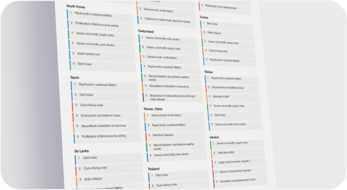 TABLE B.2 Top five risks identified by the Executive Opinion Survey (EOS) South Africa Sweden Trinidad and Tobago 1 State collapse 1 Rapid and/or sustained inflation 1 Cost-of-living crisis 2 Debt crises 2 Cost-of-living crisis 2 Digital inequality 2 Collapse of services and public 3 Debt crises 3 Severe commodity supply crises infrastructure 2 Cost-of-living crisis 4 Failure of climate-change adaptation 3 Rapid and/or sustained inflation 5 Employment and livelihood crises 5 Terrorist attacks 5 Widespread youth disillusionment 5 Geoeconomic confrontation South Korea Tunisia 1 Rapid and/or sustained inflation 5 Collapse of a systemically important industry 1 Debt crises 2 Proliferation of illicit economic activity 2 State collapse Switzerland 3 Severe commodity supply crises 1 Severe commodity price shocks 3 Severe commodity supply crises 3 Severe commodity price shocks 2 Severe commodity supply crises 4 Cost-of-living crisis 5 Asset bubble burst 3 Geoeconomic confrontation 5 Rapid and/or sustained inflation 5 Debt crises 3 Rapid and/or sustained inflation Türkiye 5 Natural disasters and extreme weather 1 Rapid and/or sustained inflation Spain events 1 Rapid and/or sustained inflation 5 Geopolitical contestation of resources 2 Employment and livelihood crises 2 Debt crises 5 Breakdown of critical infrastructure through 3 Interstate conflict cyber attacks 3 Cost-of-living crisis 4 Severe commodity supply crises Taiwan, China 4 Employment and livelihood crises 1 Geoeconomic confrontation 5 Debt crises 5 Geopolitical contestation of resources 2 Rapid and/or sustained inflation 5 Severe commodity price shocks 5 Proliferation of illicit economic activity 3 Infectious diseases Ukraine 4 Natural disasters and extreme weather 1 Severe commodity supply crises Sri Lanka events 1 Debt crises 4 Severe commodity price shocks 2 Interstate conflict 2 Cost-of-living crisis 3 Large-scale involuntary migration Thailand 3 State collapse 1 Debt crises 3 Failure of cybersecurity measures 3 Rapid and/or sustained inflation 2 Cost-of-living crisis 5 Automation and displacement of jobs 5 Severe commodity supply crises 3 Human-made environmental damage 4 Digital inequality 5 Geoeconomic confrontation Risk categories Economic Environmental Geopolitical Societal Technological Global Risks Report 2023 88