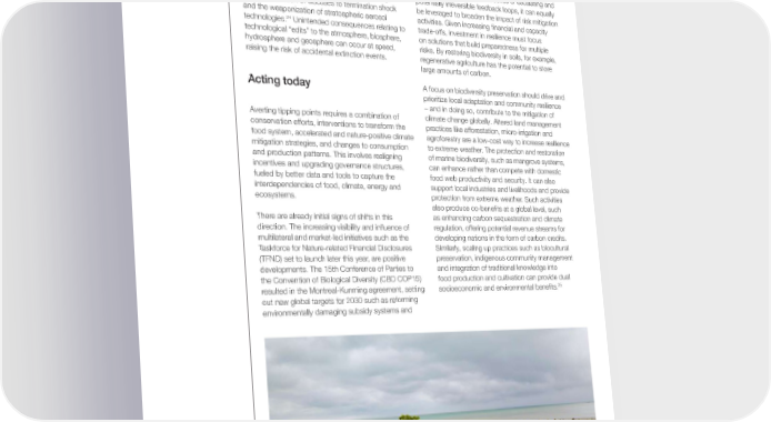 risk impacting natural ecosystems in new ways, restoring 30% of the planet’s degraded ecosystems. with limited opportunity to “昀椀eld-test” results. The These signi昀椀cant steps con昀椀rm that the global urgency of climate change mitigation is incentivizing community recognizes that the risks associated the deployment of new technologies, potentially with nature loss, food production, energy generation with less stringent testing and protocols. Carbon and climate change cannot be fully mitigated in removal technologies will be particularly essential to isolation. However, the translation into public- and achieve a net zero world if anthropogenic emissions private-sector action remains to be seen, particularly do not suf昀椀ciently decline, or emissions from natural given limited progress on previous biodiversity – and resources continue to increase. Gene editing to climate – targets to date. enhance natural carbon capture productivity, 23 geoengineering for carbon removal, and solar Although the relationship between climate and nature radiation management all pose major future risks heightens the likelihood of a series of escalating and – from enhanced water stress, nutrient “robbing” potentially irreversible feedback loops, it can equally and redistribution of diseases to termination shock be leveraged to broaden the impact of risk mitigation and the weaponization of stratospheric aerosol activities. Given increasing 昀椀nancial and capacity 24 technologies. Unintended consequences relating to trade-offs, investment in resilience must focus technological “edits” to the atmosphere, biosphere, on solutions that build preparedness for multiple hydrosphere and geosphere can occur at speed, risks. By restoring biodiversity in soils, for example, raising the risk of accidental extinction events. regenerative agriculture has the potential to store large amounts of carbon. Acting today A focus on biodiversity preservation should drive and prioritize local adaptation and community resilience – and in doing so, contribute to the mitigation of Averting tipping points requires a combination of climate change globally. Altered land management conservation efforts, interventions to transform the practices like afforestation, micro-irrigation and food system, accelerated and nature-positive climate agroforestry are a low-cost way to increase resilience mitigation strategies, and changes to consumption to extreme weather. The protection and restoration and production patterns. This involves realigning of marine biodiversity, such as mangrove systems, incentives and upgrading governance structures, can enhance rather than compete with domestic fueled by better data and tools to capture the food web productivity and security. It can also interdependencies of food, climate, energy and support local industries and livelihoods and provide ecosystems. protection from extreme weather. Such activities also produce co-bene昀椀ts at a global level, such There are already initial signs of shifts in this as enhancing carbon sequestration and climate direction. The increasing visibility and in昀氀uence of regulation, offering potential revenue streams for multilateral and market-led initiatives such as the developing nations in the form of carbon credits. Taskforce for Nature-related Financial Disclosures Similarly, scaling up practices such as biocultural (TFND) set to launch later this year, are positive preservation, indigenous community management developments. The 15th Conference of Parties to and integration of traditional knowledge into the Convention of Biological Diversity (CBD COP15) food production and cultivation can provide dual 25 resulted in the Montreal-Kunming agreement, setting socioeconomic and environmental bene昀椀ts. out new global targets for 2030 such as reforming environmentally damaging subsidy systems and Global Risks Report 2023 34