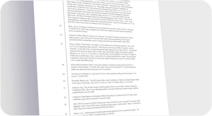 Endnotes 21. Marsh, René, “Billionaires are funding a massive treasure hunt in Greenland as ice vanishes”, CNN, 8 August 2022, https://edition.cnn.com/2022/08/08/world/greenland-melting-mineral-mining-climate/index. html; Pearce, Fred, “Why the rush to mine lithium could dry up the High Andes”, Yale Environment 360, 19 September 2022, https://e360.yale.edu/features/lithium-mining-water-andes-argentina. 22. Miller, K. A., et al., “Challenging the Need for Deep Seabed Mining From the Perspective of Metal Demand, Biodiversity, Ecosystems Services, and Bene昀椀t Sharing”, Frontiers in Marine Science, 29 July 2021, https:// www.frontiersin.org/articles/10.3389/fmars.2021.706161/full. 23. IPCC, Climate Change 2021: The Physical Science Basis, 2021, https://report.ipcc.ch/ar6/wg1/IPCC_ AR6_WGI_FullReport.pdf. 24. Trisos, Christopher, et al., “Potentially dangerous consequences for biodiversity of solar geoengineering implementation and termination”, Nature Ecology & Evolution, vol. 2, 2018, pp. 475-482; Innovative Genomics Institute, Supercharging Plants and Soils to Remove Carbon from the Atmosphere, 14 June 2022; Gibbens, Sarah, “Activists fear a new threat to biodiversity – renewable energy”, National Geographic, 26 May 2022; Gasparatos, Alexandros, et al., “Renewable energy and biodiversity: Implications for transitioning to a Green Economy”, Renewable and Sustainable Energy Reviews, vol. 70, 2017, pp. 161- 184; Sovacool, Benjamin K., Chad Baum and Sean Low, “Risk-risk governance in a low-carbon future: Exploring institutional, technological, and behavioural tradeoffs in climate geoengineering pathways”, Risk Analysis, 4 May 2022, https://onlinelibrary.wiley.com/doi/10.1111/risa.13932; Parker, Andy and Peter Irvine, “The Risk of Termination Shock from Solar Geoengineering”, Earth’s Future, 11 March 2018, https://agupubs.onlinelibrary.wiley.com/doi/full/10.1002/2017EF000735; Carlson, Colin J., et. al., “Solar geoengineering could redistribute malaria risk in developing countries”, Nature Communications, vol. 13, 20 April 2022, https://www.nature.com/articles/s41467-022-29613-w. 25. Abulu, Latoya, “On Indigenous Peoples’ Day, 昀椀ve inspirational conservation stories in the US”, Mongabay, 10 October 2022, https://news.mongabay.com/2022/10/on-indigenous-people-day-昀椀ve-inspirational- nature-conservation-stories/. 26. Hariharan, Kavitha, Adrienne Cernigoi, and Jordan Lee, “Life support: A people prescription for resilient health systems", Marsh McLennan, November 2022, https://www.marshmclennan.com/insights/ publications/2022/november/life-support-a-people-prescription-for-resilient-health-systems.html. 27. Erinoso, Olufemi, “Post-COVID-19 condition: current evidence and unanswered questions”, The Lancet, vol. 10, iss. 9, September 2022; David M., “The Economic Cost of Long COVID: An Update”, Harvard University, 16 July 2022, https://scholar.harvard.edu/cutler/news/long-covid,; Mirin, Arthur A., “A preliminary estimate of the economic impact of long COVID in the United States”, Fatigue: Biomedicine, Health & Behaviour, vol. 10, iss. 4, 17 July 2022, pp. 190-199, https://www.tandfonline.com/doi/abs/10.1080/216 41846.2022.2124064; Black, Euan, “Long COVID-19 costing Australia $100m a week”, Financial Review, 9 September 2022, https://www.afr.com/work-and-careers/workplace/long-covid-19-costing-australia- 100m-a-week-20220909-p5bgq1. 28. World Health Organization (WHO), Tuberculosis deaths and disease increase during the COVID-19 pandemic, [Press release], 27 October 2022, https://www.who.int/news/item/27-10-2022-tuberculosis- deaths-and-disease-increase-during-the-covid-19-pandemic. 29. Chumakov K, E. Ehrenfeld, V.I. Agol and E. Wimmer, “Polio eradication: falling at the 昀椀nal hurdle?”, The Lancet, 1 October 2022. 30. Romanello, Marina, et al., “The 2022 report of the Lancet Countdown on health and climate change: health at the mercy of fossil fuels”, The Lancet, vol. 400, iss. 10363, 25 October 2022, pp. 1619-1654. 31. McKeever, Amy, “Why climate change is still the greatest threat to human health”, National Geographic, 9 September 2021, https://www.nationalgeographic.com/science/article/why-climate-change-is-still-the- greatest-threat-to-human-health. 32. Institute for Health Metrics and Evaluation (IHME), Global Burden of Disease Study 2019, https://ghdx. healthdata.org/gbd-2019, accessed 21 November 2022. 33. WHO, WHO Coronavirus (COVID-19) Dashboard, https://covid19.who.int/, accessed 21 November 2022; Mallapaty, Smriti, “China COVID wave could kill one million people, models predict”, Nature, 19 December 2022, https://www.nature.com/articles/d41586-022-04502-w. 34. Murray, C.J.L., “Global burden of bacterial antimicrobial resistance in 2019: a systematic analysis”, The Lancet, vol. 399, iss. 10325, 12 February 2022, pp. 629-655. 35. Fuller, Richard, et al., “Pollution and health: a progress update”, The Lancet Planetary Health, vol. 6, iss. 6, 17 May 2022. 36. Financial Times, Backlog Britain: How public-sector delays spiralled to record levels, 27 November 2022, https://www.ft.com/content/ffdbd69b-1c7e-4fb2-b10a-d62c644bb988. 37. See World Health Organization: https://www.who.int/health-topics/health-workforce#tab=tab_1. Accessed 28 November 2022. 38. Mercer, Global insurer report: MMB health trends 2023, https://www.mercer.com/our-thinking/health/ health-trends-report.html, 2022. Global Risks Report 2023 51