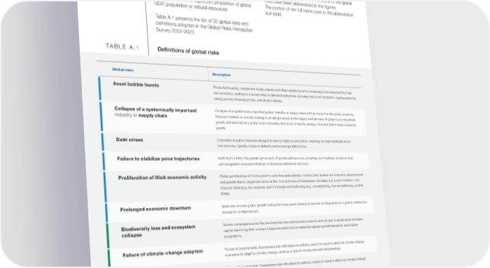 Appendix A Technical Notes: Global Risks Perception Survey 2022-2023 A “global risk” is the possibility of the occurrence To ensure legibility, the names of some of the global of an event or condition which, if it occurs, would risks have been abbreviated in the 昀椀gures. negatively impact a signi昀椀cant proportion of global The portion of the full name used in the abbreviation GDP, population or natural resources. is in bold. Table A.1 presents the list of 32 global risks and de昀椀nitions adopted in the Global Risks Perception Survey 2022-2023. TABLE A.1 De昀椀nitions of global risks Global risks Description Asset bubble bursts Prices for housing, investment funds, shares and other assets become increasingly disconnected from the real economy, leading to a severe drop in demand and prices. Includes, but is not limited to: cryptocurrencies, energy prices, housing prices, and stock markets. Collapse of a systemically important Collapse of a systemically important global industry or supply chain with an impact on the global economy, industry or supply chain financial markets or society leading to an abrupt shock to the supply and demand of systemically important goods and services at a global scale. Includes, but is not limited to: energy, food and fast-moving consumer goods. Debt crises Corporate or public finances struggle to service debt accumulation, resulting in mass bankruptcies or insolvencies, liquidity crises or defaults and sovereign debt crises. Failure to stabilize price trajectories Inability to control the general price level of goods and services, including commodities. Inclusive of an unmanageable increase (inflation) or decrease (deflation) of prices. Proliferation of illicit economic activity Global proliferation of illicit economic activities and potential violence that undermine economic advancement and growth due to organized crime or the illicit activities of businesses. Includes, but is not limited to: illicit financial flows (e.g. tax evasion); and illicit trade and trafficking (e.g. counterfeiting, human trafficking, wildlife trade). Prolonged economic downturn Near-zero or slow global growth lasting for many years leading to periods of stagnation; or a global contraction (recession or depression). Biodiversity loss and ecosystem Severe consequences for the environment, humankind and economic activity due to destruction of natural collapse capital stemming from a result of species extinction or reduction spanning both terrestrial and marine ecosystems. Failure of climate-change adaption Failure of governments, businesses and individuals to enforce, enact or invest in effective climate-change measures to adapt to climate change, such as a lack of climate-resilient infrastructure. Failure to mitigate climate change Failure of governments, businesses and individuals to enforce, enact or invest in effective climate-change mitigation measures, such as the decarbonization of economic activity. Large-scale environmental damage Loss of human life, financial loss and/or damage to ecosystems as a result of human activity and/or failure to incidents co-exist with animal ecosystems. Inclusive of deregulation of industrial accidents, oil spills and radioactive contamination. Natural disasters and extreme weather Loss of human life, damage to ecosystems, destruction of property and/or financial loss at a global scale due events to extreme weather events. Inclusive of land-based (e.g. earthquakes, volcanos wildfires), water-based (e.g. floods), atmospheric (e.g. heat-waves), and extra-terrestrial based (e.g. comet strikes and geomagnetic storms). Risk categories Economic Environmental Geopolitical Societal Technological Global Risks Report 2023 74