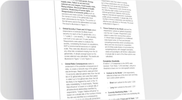 respondents to rank the top 昀椀ve risks among into account any mechanism in place to prevent 14 pre-selected risks in order of how severe the risk from occurring or prepare to mitigate they believe their impact will be on a global its impact. The respondent was provided 10 level in 2023. The 昀椀nal rank is the average rank randomly selected global risks, and was asked estimated by the respondents, weighted by to rate current effectiveness based on 昀椀ve the number of respondents who selected the options: (1) Highly ineffective, (2) Ineffective, (3) particular risk. Options included: Continued Indeterminate effectiveness, (4) Effective, and (5) waves of COVID-19, Cost-of-living crisis, Highly effective. A simple tally of the number of Cyberattacks on critical infrastructure, times a risk was identi昀椀ed on each level of the Debt crisis, Deployment of chemical and 昀椀ve-point effectiveness scale was calculated on biological weapons on a catastrophic scale, this basis. The result is illustrated in Figure 4.1. Deployment of nuclear weapons on a catastrophic scale, Disruptions in global Respondents were then asked to identify supply chains for non-food goods, Energy up to three stakeholders who can effectively supply crisis, Failure to set and meet manage the most severe risks identi昀椀ed in national net-zero targets, Food supply crisis, Section 3. Respondents could choose among Rising in昀氀ation, Structural failures in health the following eight entities: local government, systems, Weakening of human rights, and national government, bilateral, multi-country, Weaponization of economic policy such as regional, international organization, businesses, sanctions and trade controls. To ensure legibility, public-private cooperation. A simple tally of the the names of some of the global risks have number of times a stakeholder was identi昀椀ed as been abbreviated in the 昀椀gures. The portion of effective was calculated on this basis. The result the full name used in the abbreviation is in bold. is illustrated in Figure 4.1. The result is illustrated in Figure 1.1. 6. Future Outlook for the World captured the 3. Global Severity 2 Years and 10 Years asked respondents’ outlook on global cooperation respondents to estimate the likely impact over the next 10 years. Respondents were (severity) for each of the 32 global risks, on a asked to select from among three options: 1-7 scale [1 – Low severity, 7 – High severity], (1) Broad-base convergence to a multilateral over both a two-year and 10-year period. rules-based order, (2) Fractures between Respondents were asked to evaluate the competing economies which consolidate into severity, considering the impact on populations, blocs and new structures for cooperation, GDP or environmental resources on a global and (3) Wide-scale division of economies into scale. They were also allowed to nominate competing blocks with divergent standards, any other risk considered missing from the 32 values and paradigms with limited collaboration. global risks. A simple average based on the A simple tally for each of the three options was scores selected was calculated. The results are calculated. illustrated in Figure 1.2 and Figure 2.1. Completion thresholds 4. Global Risks Consequences seeks to A total of 1,316 responses to the GRPS were understand of the potential consequences of received. From these, 1,249 were kept, using as a risks, to create a network map of the global threshold at least one non-demographic answer. risk landscape. Respondents were provided 10 randomly selected global risks (from the full • Outlook for the World: 1,244 respondents list of 32 global risks), and were then asked selected at least one of the short-term and long- to select up to 昀椀ve global risks (from the full term world outlook options. list) likely to be triggered by each of the 10 risks materializing. In visual results, “Nodes: – Short-term outlook for the world: 1,233 Risk in昀氀uence” is based on a simple tally of all bidirectional relationships identi昀椀ed by – Long-term outlook for the world: 1,231 respondents. “Edges: Relative in昀氀uence” is based on a simple tally of the number of times • Currently Manifesting Risks: 1,180 the risk was identi昀椀ed as a consequence. respondents ranked at least one manifesting risk. However, visual do not show all connections: weaker relationships identi昀椀ed by less than 25% • Global Severity 2 Years and 10 Years: 1,091 of respondents were not included as edges. respondents evaluated the severity of at least "Employment crises" was not offered as a one risk in one time frame. randomly selected risk, and is shown only as a consequence. “Prolonged economic downturn” – Short-term severity: 1,086 was not offered as a consequence, and is only shown as a cause. – Long-term severity: 999 5. Risk Preparedness and Governance • Global Risks Consequences: 877 respondents asked respondents to indicate the current paired at least one materializing risk with its effectiveness of risk management across consequence. economies and multiple stakeholders, taking Global Risks Report 2023 77
