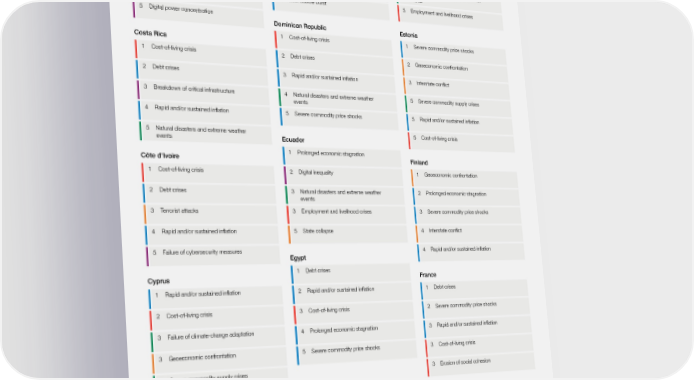 TABLE B.2 Top five risks identified by the Executive Opinion Survey (EOS) Congo (Democratic Republic of) Denmark El Salvador 1 Digital inequality 1 Breakdown of critical infrastructure 1 Debt crises 2 State collapse 2 Rapid and/or sustained inflation 2 State collapse 3 Debt crises 3 Severe commodity price shocks 3 Cost-of-living crisis 5 Interstate conflict 4 Geoeconomic confrontation 4 Natural disasters and extreme weather events 5 Cost-of-living crisis 5 Asset bubble burst 5 Employment and livelihood crises 5 Digital power concentration Dominican Republic Estonia 1 Cost-of-living crisis 1 Severe commodity price shocks Costa Rica 1 Cost-of-living crisis 2 Debt crises 2 Geoeconomic confrontation 2 Debt crises 3 Rapid and/or sustained inflation 3 Interstate conflict 3 Breakdown of critical infrastructure 4 Natural disasters and extreme weather 5 Severe commodity supply crises events 4 Rapid and/or sustained inflation 5 Severe commodity price shocks 5 Rapid and/or sustained inflation 5 Natural disasters and extreme weather 5 Cost-of-living crisis events Ecuador 1 Prolonged economic stagnation Côte d'Ivoire Finland 1 Cost-of-living crisis 2 Digital inequality 1 Geoeconomic confrontation 2 Debt crises 3 Natural disasters and extreme weather 2 Prolonged economic stagnation events 3 Terrorist attacks 3 Employment and livelihood crises 3 Severe commodity price shocks 4 Rapid and/or sustained inflation 5 State collapse 4 Interstate conflict 5 Failure of cybersecurity measures 4 Rapid and/or sustained inflation Egypt 1 Debt crises Cyprus France 1 Rapid and/or sustained inflation 2 Rapid and/or sustained inflation 1 Debt crises 2 Cost-of-living crisis 3 Cost-of-living crisis 2 Severe commodity price shocks 3 Failure of climate-change adaptation 4 Prolonged economic stagnation 3 Rapid and/or sustained inflation 3 Geoeconomic confrontation 5 Severe commodity price shocks 3 Cost-of-living crisis 5 Severe commodity supply crises 3 Erosion of social cohesion Czechia 1 Rapid and/or sustained inflation 2 Severe commodity supply crises 3 Severe commodity price shocks 4 Geopolitical contestation of resources 5 Interstate conflict Risk categories Economic Environmental Geopolitical Societal Technological Global Risks Report 2023 82