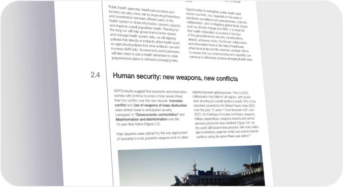 In parallel, national and global health institutions Acting today and systems need to be strengthened in the face of multiple challenges. Innovation in care delivery, It is essential that we embed hard-earned lessons in staf昀椀ng and funding models are required for health preparedness for the next iteration of health crises. systems to provide disease prevention, early A continued focus on public health policy and detection and complex care cost-effectively for interventions can have outsized impacts at national an increasingly frail and chronically ill population. and regional levels, as a great deal of chronic There is also potential for healthcare to reap the 48 disease burden is, in fact, preventable. Realizing advantages of technological advances and digital public health gains will require governments and transformation that other sectors have embraced, business to promote the conditions that underpin such as augmenting capacity with technology and wellbeing and encourage healthy lifestyles, such combining virtual and in-person care to reduce as good food, clean air, secure housing and social costs. cohesion. Opportunities to strengthen public health exist Public health agencies, healthcare providers and across countries, too, especially in the areas of funders can play a key role by improving interactions pandemic surveillance and preparedness, scienti昀椀c and coordination between different parts of the collaboration, and in mitigating global threat drivers health system to share information, expand capacity such as climate change and AMR. It is essential and improve overall population health. Planning for that health nationalism is avoided in the face the long run will help governments better assess of the geopolitical and security considerations and manage health system risks, as will aligning already underway today. Continued collaboration policies that directly or indirectly affect health (such and information 昀氀ows in the 昀椀eld of healthcare, as agricultural policies that drive antibiotic use and pharmaceuticals and life sciences underpin efforts increase AMR risk). Governments and businesses to ensure that our understanding and capability can will also need to add a health dimension to crisis continue to effectively address emerging health risks. preparedness plans to withstand emerging risks. 2.4 Human security: new weapons, new con昀氀icts GRPS results suggest that economic and information clashes between global powers. Prior to 2022, warfare will continue to pose a more severe threat militarization had fallen in all regions, with recent than hot con昀氀ict over the next decade. Interstate data showing an overall decline in nearly 70% of the con昀氀ict and Use of weapons of mass destruction countries covered by the Global Peace Index 2022 49 were ranked lower in anticipated severity over the past 15 years. Even between 2021 and compared to “Geoeconomic confrontation” and 2022, the holdings of nuclear and heavy weapons, Misinformation and disinformation over the military expenditure, weapons imports and armed 10-year time frame (Figure 2.2). services personnel rates declined (Figure 2.6). Yet the world still became less peaceful, with more violent Past decades were de昀椀ned by the non-deployment demonstrations, external con昀氀ict and intense internal 50 of humanity’s most powerful weapons and no direct con昀氀icts during the same 昀椀fteen-year period. Global Risks Report 2023 38