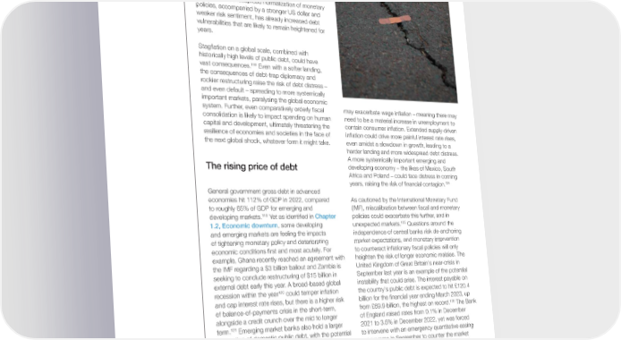 2.6 Economic stability: global debt distress The threat of a sovereign debt crisis has been brewing, with public debt growing as interest rates have fallen. Governments have leveraged cheap money to invest in future growth and help stabilize distressed 昀椀nancial systems, providing massive 昀椀scal support during the pandemic and to shield households and businesses from the current cost- of-living crisis. However, high levels of debt may not be sustainable under tighter economic conditions. The rapid and widespread normalization of monetary policies, accompanied by a stronger US dollar and weaker risk sentiment, has already increased debt vulnerabilities that are likely to remain heightened for years. Stag昀氀ation on a global scale, combined with historically high levels of public debt, could have 118 vast consequences. Even with a softer landing, the consequences of debt-trap diplomacy and rockier restructuring raise the risk of debt distress – and even default – spreading to more systemically important markets, paralysing the global economic system. Further, even comparatively orderly 昀椀scal may exacerbate wage in昀氀ation – meaning there may consolidation is likely to impact spending on human need to be a material increase in unemployment to capital and development, ultimately threatening the contain consumer in昀氀ation. Extended supply-driven resilience of economies and societies in the face of in昀氀ation could drive more painful interest rate rises, the next global shock, whatever form it might take. even amidst a slowdown in growth, leading to a harder landing and more widespread debt distress. A more systemically important emerging and The rising price of debt developing economy – the likes of Mexico, South Africa and Poland – could face distress in coming 124 years, raising the risk of 昀椀nancial contagion. General government gross debt in advanced economies hit 112% of GDP in 2022, compared As cautioned by the International Monetary Fund to roughly 65% of GDP for emerging and (IMF), miscalibration between 昀椀scal and monetary 119 developing markets. Yet as identi昀椀ed in Chapter policies could exacerbate this further, and in 125 1.2, Economic downturn, some developing unexpected markets. Questions around the and emerging markets are feeling the impacts independence of central banks risk de-anchoring of tightening monetary policy and deteriorating market expectations, and monetary intervention economic conditions 昀椀rst and most acutely. For to counteract in昀氀ationary 昀椀scal policies will only example, Ghana recently reached an agreement with heighten the risk of longer economic malaise. The the IMF regarding a $3 billion bailout and Zambia is United Kingdom of Great Britain's near-crisis in seeking to conclude restructuring of $15 billion in September last year is an example of the potential external debt early this year. A broad-based global instability that could arise. The interest payable on 120 recession within the year could temper in昀氀ation the country's public debt is expected to hit £120.4 and cap interest rate rises, but there is a higher risk billion for the 昀椀nancial year ending March 2023, up 126 of balance-of-payments crisis in the short-term, from £69.9 billion, the highest on record. The Bank alongside a credit crunch over the mid to longer of England raised rates from 0.1% in December 121 term. Emerging market banks also hold a larger 2021 to 3.5% in December 2022, yet was forced proportion of domestic public debt, with the potential to intervene with an emergency quantitative easing for distress to spread to banks, households and programme in September to counter the market 122 pension funds. Larger emerging markets exhibiting reaction to the UK government’s proposed 昀椀scal 127 a heightened risk of default include Argentina, Egypt, stimulus. In the absence of a global shock, the 123 Ghana, Kenya, Tunisia, Pakistan and Türkiye. “veto power” of the markets will increasingly limit 128 昀椀scal expansion, even in advanced economies. Downside risks loom large, and another global shock could result in deeper and more prolonged economic disorder. Stag昀氀ation remains a severe risk for many The new geopolitics of debt economies. Current crises, such as the war in Ukraine and lingering impacts of COVID-19, are still impacting basic inputs, including labour, energy and For now, the ratio of defaulted versus total global food. Continued tightness in major labour markets public debt remains very low by historic standards Global Risks Report 2023 46