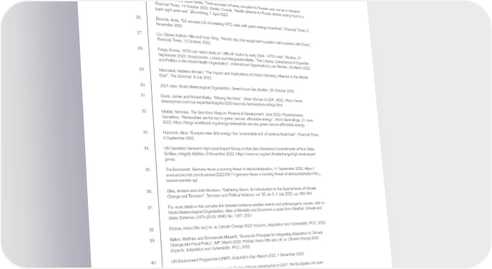 Endnotes 21. Wheatley, Jonathan, “Out昀氀ows from emerging market bond funds reach $70 billion in 2022”, Financial Times, 2 October 2022. 22. Chabert, Guillaume, Martin Cerisola and Dalia Hakura, "Restructuring debt of poorer nations requires more ef昀椀cient coordination”, IMF Blogs, 7 April 2022. 23. Schnabel, Isabel, Speech: A new age of energy in昀氀ation: climate昀氀ation, fossil昀氀ation, and green昀氀ation, 17 March 2022, speech presented at The ECB and its Watchers XXII Conference, Frankfurt, https:// www.ecb.europa.eu/press/key/date/2022/html/ecb.sp220317_2~dbb3582f0a.en.html, accessed 14 November 2022. 24. Leggett, Theo, “Germany takes control of stakes in Rosneft oil re昀椀neries”, BBC, 16 September 2022, https://www.bbc.com/news/business-62924071. 25. Bryan, Kenza and Sarah White, “Total accused of being complicit in Russian war crimes in Ukraine”, Financial Times, 14 October 2022; Gretler, Connie, “Nestle defends its Russia stance saying food is a basic right amid war”, Bloomberg, 7 April 2022. 26. Bounds, Andy, “EU accuses US of breaking WTO rules with green energy incentives”, Financial Times, 6 November 2022. 27. Liu, Qianer, Kathrin Hille and Yuan Yang, “World’s top chip equipment suppliers halt business with China”, Financial Times, 13 October 2022. 28. Farge, Emma, “WTO can reach deals on 'dif昀椀cult' topics by early 2024 - WTO chief”, Reuters, 27 September 2022; Gruszczynski, Lukasz and Margherita Melillo, “The Uneasy Coexistence of Expertise and Politics in the World Health Organization”, International Organisations Law Review, 24 March 2022. 29. Moonakal, Nadeem Ahmed, “The Impact and Implications of China’s Growing In昀氀uence in the Middle East”, The Diplomat, 9 July 2022. 30. 2021 data. World Meterological Organization, Greenhouse Gas Bulletin, 26 October 2022. 31. Davis, James and Robert Bailey, “Missing the Mark”, Oliver Wyman & CDP, 2022, https://www. oliverwyman.com/our-expertise/insights/2022/sep/cdp-temperature-ratings.html. 32. Mulder, Nicholas, The Sanctions Weapon, Finance & Development, June 2022; Papathanasiou, Demetrios, “Renewables are the key to green, secure, affordable energy”, World Bank Blogs, 21 June 2022, https://blogs.worldbank.org/energy/renewables-are-key-green-secure-affordable-energy. 33. Hancock, Alice, “Europe’s new dirty energy: the ‘unavoidable evil’ of wartime fossil fuels”, Financial Times, 6 September 2022. 34. UN Secretary General’s High-Level Expert Group on Net-Zero Emissions Commitments of Non-State Entities, Integrity Matters, 8 November 2022, https://www.un.org/en/climatechange/high-level-expert- group. 35. The Economist, Germany faces a looming threat of deindustrialisation, 11 September 2022, https:// www.economist.com/business/2022/09/11/germany-faces-a-looming-threat-of-deindustrialisation?itm_ source=parsely-api. 36. Silke, Andrew and John Morrison, “Gathering Storm: An Introduction to the Special Issue of Climate Change and Terrorism”, Terrorism and Political Violence, vol. 35, iss 5, 5 July 2022, pp. 883-893. 37. For more detail on the complex link between extreme weather events and anthropogenic causes, refer to World Meteorological Organization, Atlas of Mortality and Economic Losses from Weather, Climate and Water Extremes (1970–2019), WMO-No. 1267, 2021. 38. Pörtner, Hans-Otto (ed.) et. al, Climate Change 2022: Impacts, Adaptation and Vulnerability, IPCC, 2022. 39. Bellon, Matthieu and Emmanuele Massetti, “Economic Principles for Integrating Adaptation to Climate Change into Fiscal Policy”, IMF, March 2022; Pörtner, Hans-Otto (ed.) et. al, Climate Change 2022: Impacts, Adaptation and Vulnerability, IPCC, 2022. 40. UN Environment Programme (UNEP), Adaptation Gap Report 2022, 1 November 2022. 41. Bevere, Lucia and Federica Remondi, Sigma: Natural catastrophes in 2021: the 昀氀oodgates are open, Swiss Re Institute, 30 March 2022. 42. Ibid. 43. Formerly described as “Profound social instability” in the GRPS. 44. Ganesh, Janan, “Anarchy is a likelier future for the west than tyranny”, Financial Times, 21 June 2022. 45. Carnegie Endowment for International Peace, Global Protest Tracker, 2022, November 9, https:// carnegieendowment.org/publications/interactive/protest-tracker. Global Risks Report 2023 27
