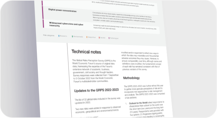 TABLE A.1 De昀椀nitions of Global Risks Global risks Description Adverse outcomes of frontier Intended or unintended negative consequences of technological advances on individuals, businesses, technologies ecosystems and/or economies. Includes, but is not limited to: AI, brain-computer interfaces, biotechnology, geo-engineering, quantum computing and the metaverse. Breakdown of critical information Deterioration, overload or shutdown of critical physical and digital infrastructure or services leading to infrastructure the breakdown of internet, cellular devices, public utilities or satellites. Stemming from, but not limited to, cyberattacks, intentional or unintentional physical damage, or solar storms. Digital inequality and lack of access to Fractured or unequal access to digital networks and technologies stemming from underinvestment, low digital digital services skills, insufficient purchasing power, or government restrictions on technologies. Digital power concentration Concentration of critical digital assets, capabilities or knowledge among a small number of individuals, businesses or states that can control access to digital technologies and demand discretionary pricing. Stemming from, but not limited to, the failure of anti-trust regulation, inadequate investment in the innovation ecosystem, or state control over key technologies. Widespread cybercrime and cyber Increasingly sophisticated cyberespionage or cybercrimes. Includes, but is not limited to: loss of privacy, data insecurity fraud or theft, and cyber espionage. Risk categories Economic Environmental Geopolitical Societal Technological Technical notes modi昀椀ed and/or expanded to re昀氀ect new ways in which the risks may materialize and the potential adverse outcomes they may cause. However, to The Global Risks Perception Survey (GRPS) is the ensure comparability over time, although names and World Economic Forum’s source of original risks de昀椀nitions were modi昀椀ed, the fundamental concept data, harnessing the expertise of the Forum’s of each risk has remained consistent with that of extensive network of academic, business, previous versions of the survey. government, civil society and thought leaders. Survey responses were collected from 7 September to 5 October 2022 from the World Economic Methodology Forum’s multistakeholder communities. The GRPS 2022–2023 was further re昀椀ned this year Updates to the GRPS 2022-2023 to gather more granular perceptions of risk and to incorporate new approaches to risk management and analysis. The GRPS 2022–2023 was comprised The list of 32 global risks included in the survey was of six sections: updated in 2022. 1. Outlook for the World asked respondents to Two new risks were added in response to observed characterize their outlook for the world over economic, geopolitical and environmental trends: the short term (two years) and the long term (10 years). Respondents were provided with 1. “Cost-of-living crisis” 昀椀ve options: (1) Progressive tipping points and persistent crises leading to catastrophic 2. “Misinformation and disinformation” outcomes, (2) Consistently volatile across economies and industries with multiple shocks In addition, “Climate action failure” was delineated accentuating divergent trajectories, (3) Slightly into two separate risks: volatile with occasional localized surprises, (4) Limited volatility with relative stability, and 1. “Failure of climate-change adaption” (5) Renewed stability with a revival of global resilience. A simple tally for each of the 昀椀ve 2. “Failure to mitigate climate change” options was calculated. The result is illustrated in Figure 1.10. The names and de昀椀nitions of the remaining risks have been revised and, where applicable, merged, 2. Currently Manifesting Risks asked Global Risks Report 2023 76