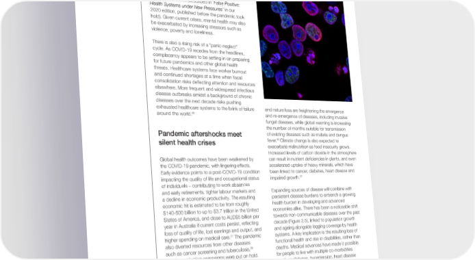 2.3 Human health: perma-pandemics and chronic capacity challenges Global public health is under growing pressure and health systems around the world are at risk of becoming un昀椀t for purpose. The COVID-19 pandemic further ampli昀椀ed ever-present spectres and emerging risks to physical and mental health, including antimicrobial resistance (AMR), vaccine hesitancy and climate-driven nutritional and infectious diseases (described in ‘False Positive: Health Systems under New Pressures’ in our 2020 edition, published before the pandemic took hold). Given current crises, mental health may also be exacerbated by increasing stressors such as violence, poverty and loneliness. There is also a rising risk of a “panic-neglect” cycle. As COVID-19 recedes from the headlines, complacency appears to be setting in on preparing for future pandemics and other global health threats. Healthcare systems face worker burnout and continued shortages at a time when 昀椀scal consolidation risks de昀氀ecting attention and resources elsewhere. More frequent and widespread infectious disease outbreaks amidst a background of chronic diseases over the next decade risks pushing exhausted healthcare systems to the brink of failure and nature loss are heightening the emergence 26 around the world. and re-emergence of diseases, including invasive fungal diseases, while global warming is increasing the number of months suitable for transmission Pandemic aftershocks meet of existing diseases such as malaria and dengue 30 silent health crises fever. Climate change is also expected to exacerbate malnutrition as food insecurity grows. Increased levels of carbon dioxide in the atmosphere Global health outcomes have been weakened by can result in nutrient de昀椀ciencies in plants, and even the COVID-19 pandemic, with lingering effects. accelerated uptake of heavy minerals, which have Early evidence points to a post-COVID-19 condition been linked to cancer, diabetes, heart disease and impacting the quality of life and occupational status impaired growth.31 of individuals – contributing to work absences and early retirements, tighter labour markets and Expanding sources of disease will combine with a decline in economic productivity. The resulting persistent disease burdens to entrench a growing economic hit is estimated to be from roughly health burden in developing and advanced $140-600 billion to up to $3.7 trillion in the United economies alike. There has been a noticeable shift States of America, and close to AUD$5 billion per towards non-communicable diseases over the past year in Australia if current costs persist, re昀氀ecting decade (Figure 2.5), linked to population growth loss of quality of life, lost earnings and output, and and ageing alongside lagging coverage by health 27 higher spending on medical care. The pandemic systems. A key implication is the resulting loss of also diverted resources from other diseases functional health and rise in disabilities, rather than such as cancer screening and tuberculosis,28 deaths. Medical advances have made it possible and immunization campaigns were put on hold. for people to live with multiple co-morbidities Vaccination rates for polio fell to the lowest level in (such as diabetes, hypertension, heart disease 14 years, perhaps ushering in the return of the wild and depression), but these remain complex and 29 strain to Africa in 2021. expensive to manage. People are living more years in poor health, and we may soon face a more Beyond the lingering impact of COVID-19, the sustained reversal in life expectancy gains beyond potential stresses imposed by climate change and the in昀氀uence of the pandemic. nature loss on health are likely to grow, ranging from air pollution and heightened exposure to wet Notably, although some disease burdens are heatwave days (which increase heat stress on growing, all health-related risks fell into roughly humans), to disrupted access to safe water and the bottom third of the GRPS’ global risk rankings sanitation and increases in waterborne diseases over both the two- and 10-year period (Figure due to 昀氀oods. Urbanization, land use change 2.2). “Infectious diseases” plummeted in risk Global Risks Report 2023 35