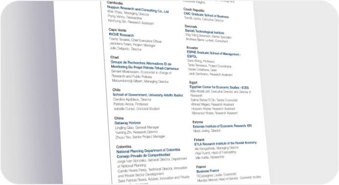 Cambodia Ramatou Fall, Director of Business Climate Nuppun Research and Consulting Co., Ltd Simon Meledje, Head of Planning and Monitoring Pisey Khin, Director Bernadine Yeble N'Guessan, Research of昀椀cer Chanthan Tha, Researcher Dalen Vyla, Research Assistant Cyprus Cyprus Employers and Industry Confederation - Cameroon OEB Compétitivité Cameroon Antonis Frangoudis, Director Business Development Hermann Fotie Ii, Permanent Secretary and Economic Affairs Department Tanankem Belmondo Voufo, Expert Investment Bank of Cyprus Climate Kyriacos Antoniou, Governance Of昀椀cer Jean Baptiste Nsoe Nkouli, Competitiveness Andreas Alexandrou, Manager Strategy and Observatory Expert Customer Insights Cambodia Czech Republic Nuppun Research and Consulting Co., Ltd CMC Graduate School of Business Khin Pisey, Managing Director Tomáš Janča, Executive Director Pong Vanny, Researcher Kimhong Sin, Research Assistant Denmark Danish Technological Institute Cape Verde Stig Yding Sørensen, Senior Specialist INOVE Research Andreas Bjerre Lunkeit, Consultant Frantz Tavares, Chief Executive Of昀椀cer Jerónimo Freire, Project Manager Ecuador Júlio Delgado, Director ESPAE Graduate School of Management - ESPOL Chad Sara Wong, Professor Groupe de Recherches Alternatives Et de Tania Tenesaca, Project Coordinator Monitoring Du Projet Pétrole-Tchad-Cameroun Xavier Ordeñana, Dean Simael Mbairassem, Economist in charge of Jack Zambrano, Research Assistant Research and Public Policies Maoundonodji Gilbert, Managing Director Egypt Egyptian Center for Economic Studies - ECES Chile Abla Abdel Latif, Executive Director, and Director of School of Government, University Adolfo Ibañez Research Carolina Apablaza, Director Salma Bahaa El Din, Senior Economist Patricio Aroca, Professor Ahmed Maged, Research Assistant Isabella Cuneo, Doctoral Student Hossam Khater, Research Assistant Mohamed Khater, Research Assistant China Dataway Horizon Estonia Lingling Qiao, General Manager Estonian Institute of Economic Research -EKI Yuming Zhi, Research Director Marje Josing, Director Zhuyu Yao, Senior Project Manager Finland Colombia ETLA Research Institute of the Finnish Economy National Planning Department of Colombia Aki Kangasharju, Managing Director Consejo Privado de Competitividad Päivi Puonti, Head of Forecasting Jorge Ivan Gonzalez, General Director, Department Ville Kaitila, Researcher of National Planning Camilo Rivera Perez, Technical Director, Innovation France and Private Sector Development Business France Sara Patricia Rivera, Adviser, Innovation and Private RCassagnes Louise, Economist Sector Development Marcias Manuel, Head of Service : Economic studies Congo, Democratic Republic of Congo-Invest Consulting Georgia Teza Bila Minlangu, Administrator TSU Center for Analysis and Forecasting Faila Tabu Ngandi, Managing Director Vakhtang Charaia, Director Bertin Muderhwa, Head of Service in charge Otar Anguridze, Head of the Board of Studies and Statistics at the Federation of Shota Gulbani, Expert Businesses of Congo Mariam Lashkhi, Project Manager Mamuka Tsereteli, Expert Côte d'Ivoire Centre de Promotion des Investissements en Côte D’ivoire - CEPICI Solange Amichia, CEO Global Risks Report 2023 91