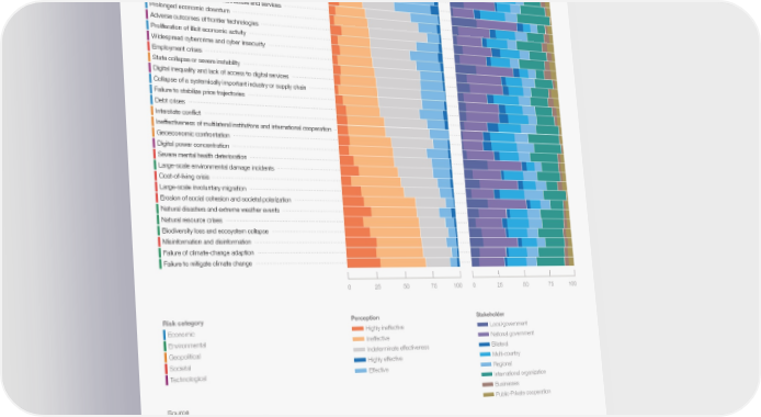 FIGURE F Perceptions around preparedness and governance Risk name Risk preparedness Risk governance Please indicate the current effectiveness of Which set of stakeholders can most effectively risk management, taking into account mechanisms manage the risk? in place to prevent the risk from occurring or prepare to mitigate its impact Terrorist attacks Infectious diseases Breakdown of critical information infrastructure Asset bubble bursts Chronic diseases and health conditions Use of weapons of mass destruction Collapse or lack of public infrastructure and services Prolonged economic downturn Adverse outcomes of frontier technologies Proliferation of illicit economic activity Widespread cybercrime and cyber insecurity Employment crises State collapse or severe instability Digital inequality and lack of access to digital services Collapse of a systemically important industry or supply chain Failure to stabilize price trajectories Debt crises Interstate conflict Ineffectiveness of multilateral institutions and international cooperation Geoeconomic confrontation Digital power concentration Severe mental health deterioration Large-scale environmental damage incidents Cost-of-living crisis Large-scale involuntary migration Erosion of social cohesion and societal polarization Natural disasters and extreme weather events Natural resource crises Biodiversity loss and ecosystem collapse Misinformation and disinformation Failure of climate-change adaption Failure to mitigate climate change 0 25 50 75 100 0 25 50 75 100 Risk category Perception Stakeholder Economic Highly ineffective Local government Environmental Ineffective National government Geopolitical Indeterminate effectiveness Bilateral Societal Highly effective Multi-country Technological Effective Regional International organization Businesses Source Public-Private cooperation World Economic Forum, Global Risks Perception Survey 2022-2023. Global Risks Report 2023 12