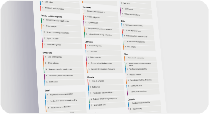 TABLE B.2 Top five risks identified by the Executive Opinion Survey (EOS) Bolivia (Plurinational State of) Bulgaria Chad 1 Prolonged economic stagnation 1 Rapid and/or sustained inflation 1 Employment and livelihood crises 1 Digital inequality 2 Proliferation of illicit economic activity 2 Geopolitical contestation of resources 3 Employment and livelihood crises 3 Cost-of-living crisis 3 Terrestrial biodiversity loss and ecosystem collapse 4 State collapse 4 Interstate conflict 4 Blue biodiversity loss and ecosystem collapse 5 Human-made environmental damage 5 State collapse 5 Debt crises 5 Debt crises 5 Digital inequality Cambodia 5 Erosion of social cohesion 1 Geoeconomic confrontation 5 Digital power concentration 2 Cost-of-living crisis Bosnia and Herzegovina Chile 1 Severe commodity supply crises 2 Digital inequality 1 Rapid and/or sustained inflation 1 State collapse 4 Geopolitical contestation of resources 2 Erosion of social cohesion 3 Severe commodity price shocks 5 Failure of climate-change adaptation 3 Proliferation of illicit economic activity 4 Digital inequality 4 Severe commodity supply crises Cameroon 5 Cost-of-living crisis 1 Cost-of-living crisis 5 State collapse 2 Debt crises Botswana China 1 Cost-of-living crisis 3 Digital inequality 1 Geoeconomic confrontation 2 State collapse 4 Employment and livelihood crises 2 Natural disasters and extreme weather events 3 Severe commodity supply crises 5 Geopolitical contestation of resources 3 Rapid and/or sustained inflation 4 Failure of cybersecurity measures 4 Infectious diseases Canada 5 Debt crises 1 Cost-of-living crisis 5 Geopolitical contestation of resources 2 Debt crises 5 Asset bubble burst Brazil 1 Rapid and/or sustained inflation 3 Rapid and/or sustained inflation 5 Digital power concentration 2 Proliferation of illicit economic activity 4 Failure of climate-change adaptation Colombia 3 Geoeconomic confrontation 5 Asset bubble burst 1 Rapid and/or sustained inflation 4 Severe commodity price shocks 2 Digital inequality Cape Verde 4 Employment and livelihood crises 1 Debt crises 3 Employment and livelihood crises 2 Cost-of-living crisis 4 State collapse 3 Geoeconomic confrontation 5 Cost-of-living crisis 4 Rapid and/or sustained inflation 5 Employment and livelihood crises Risk categories Economic Environmental Geopolitical Societal Technological Global Risks Report 2023 81