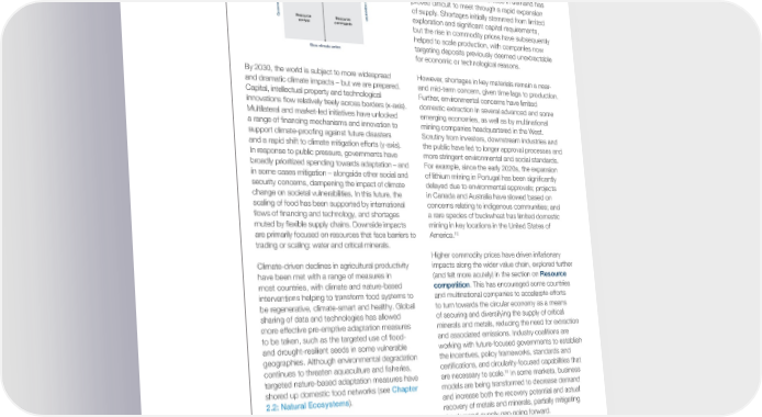 3.3 Four futures for 2030 Risks remain: some natural resources are scarce, Resource collaboration – even in a climate-adapted, geopolitically cooperative the danger of natural scarcity world. Demand for geographically concentrated critical metals and minerals has risen dramatically, re昀氀ecting a push for secure, renewable energy Accelerated climate action sources in the wake of the war in Ukraine, and renewed urgency of net-zero ambitions over recent Resource Resource Geoeconomic cooperationyears. Despite suf昀椀cient resource deposits in most competition collaboration 9 minerals, this exponential increase in demand has ontation proved dif昀椀cult to meet through a rapid expansion of supply. Shortages initially stemmed from limited exploration and signi昀椀cant capital requirements, Geoeconomic confrResourceResource control constraints but the rise in commodity prices have subsequently helped to scale production, with companies now Slow climate action targeting deposits previously deemed unextractable for economic or technological reasons. By 2030, the world is subject to more widespread However, shortages in key materials remain a near- and dramatic climate impacts – but we are prepared. and mid-term concern, given time lags to production. Capital, intellectual property and technological Further, environmental concerns have limited innovations 昀氀ow relatively freely across borders (x-axis). domestic extraction in several advanced and some Multilateral and market-led initiatives have unlocked emerging economies, as well as by multinational a range of 昀椀nancing mechanisms and innovation to mining companies headquartered in the West. support climate-proo昀椀ng against future disasters Scrutiny from investors, downstream industries and and a rapid shift to climate mitigation efforts (y-axis). the public have led to longer approval processes and In response to public pressure, governments have more stringent environmental and social standards. broadly prioritized spending towards adaptation – and For example, since the early 2020s, the expansion in some cases mitigation – alongside other social and of lithium mining in Portugal has been signi昀椀cantly security concerns, dampening the impact of climate delayed due to environmental approvals; projects change on societal vulnerabilities. In this future, the in Canada and Australia have slowed based on scaling of food has been supported by international concerns relating to indigenous communities; and 昀氀ows of 昀椀nancing and technology, and shortages a rare species of buckwheat has limited domestic muted by 昀氀exible supply chains. Downside impacts mining in key locations in the United States of are primarily focused on resources that face barriers to America.10 trading or scaling: water and critical minerals. Higher commodity prices have driven in昀氀ationary Climate-driven declines in agricultural productivity impacts along the wider value chain, explored further have been met with a range of measures in (and felt more acutely) in the section on Resource most countries, with climate and nature-based competition. This has encouraged some countries interventions helping to transform food systems to and multinational companies to accelerate efforts be regenerative, climate-smart and healthy. Global to turn towards the circular economy as a means sharing of data and technologies has allowed of securing and diversifying the supply of critical more effective pre-emptive adaptation measures minerals and metals, reducing the need for extraction to be taken, such as the targeted use of 昀氀ood- and associated emissions. Industry coalitions are and drought-resilient seeds in some vulnerable working with future-focused governments to establish geographies. Although environmental degradation the incentives, policy frameworks, standards and continues to threaten aquaculture and 昀椀sheries, certi昀椀cations, and circularity-focused capabilities that 11 targeted nature-based adaptation measures have are necessary to scale. In some markets, business shored up domestic food networks (see Chapter models are being transformed to decrease demand 2.2: Natural Ecosystems). and increase both the recovery potential and actual recovery of metals and minerals, partially mitigating The allocation of risk has begun to shift away from the demand-supply gap going forward. vulnerable workforces and communities. The burden of continued weather shocks has been partially Despite these efforts and continued climate offset through adaptation actions, 昀椀nanced by 昀椀t-for- ambitions, higher prices and shortages are slowing purpose 昀椀nancial products, including weather-based momentum for the green energy transition in the index insurance, climate-related loan products, short-term. In lower-income economies without local guaranteed credit lines, and well-managed risk- minerals and metals assets, the promise of support 8 based exits from extreme-event-prone geographies. with green energy infrastructure is partly unful昀椀lled, Supply shocks stemming from natural disasters are and some are considering reverting to carbon- quickly absorbed by 昀氀exible, market-driven supply intensive energy sources to secure energy.12 chains, and global food insecurity continues to slowly trend downwards. The ability to scale water supply has similarly been Global Risks Report 2023 60