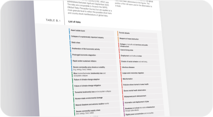 Appendix B Executive Opinion Survey: National Risk Perceptions Figure B.1 presents the list of 35 risks that were To ensure legibility, the names of some of the global incorporated into the World Economic Forum’s risks have been abbreviated in the 昀椀gures. The 2022 Executive Opinion Survey (EOS), which was portion of the full name used in the abbreviation is administered between April and September 2022. in bold. The risks are comparable to those in the GRPS (Global Risks Perception Survey) but are applied at a more granular level to re昀氀ect the possible short-term and country-level manifestations of global risks. TABLE B.1 List of risks Asset bubble burst Terrorist attacks Collapse of a systemically important industry Weapons of mass destruction Debt crises Collapse or lack of social services and public infrastructure Proliferation of illicit economic activity Cost-of-living crisis Prolonged economic stagnation Employment and livelihood crises Rapid and/or sustained inflation Erosion of social cohesion and well-being Severe commodity price shocks or volatility Infectious diseases (e.g. energy, food, metals) Blue (marine/freshwater) biodiversity loss and Large-scale involuntary migration ecosystem collapse Failure of climate-change adaption Misinformation Failure of climate-change mitigation Pollution-driven harms to human health Terrestrial biodiversity loss and ecosystem collapse Severe mental health deterioration Human-made environmental damage Widespread youth disillusionment Natural disasters and extreme weather events Automation and displacement of jobs Severe commodity supply crises Breakdown of critical information infrastructure (incl. energy, food, water) through cyber attacks Geoeconomic confrontations Digital power concentration and monopolies (incl. sanctions, trade wars, investment screening) Geopolitical contestation of strategic resources Failure of cybersecurity measures (incl. loss of privacy, (incl. technology, energy, minerals) data fraud or theft, cyber espionage) Interstate conflict Lack of widespread digital services and digital inequality State collapse Risk categories Economic Environmental Geopolitical Societal Technological Source World Economic Forum Global Risks Perception Survey 2022-2023. Global Risks Report 2023 79