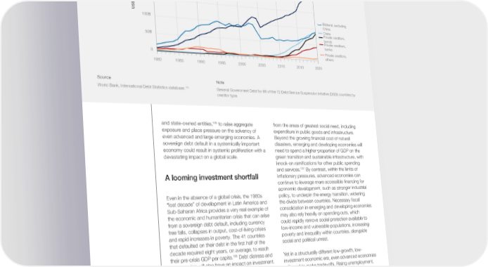 FIGURE 2.10 The composition of public debt B. General government debt 300B 250B Multilateral 200B 150B US$ (billions) Bilateral, excluding 100B China China Private creditors, 50B bonds Private creditors, banks Private creditors, 0 others 1980 1985 1990 1995 2000 2005 2010 2015 2020 Source Note World Bank, International Debt Statistics database.134 General Government Debt for 68 of the 72 Debt Service Suspension Initiative (DSSI) countries by creditor type. 135 and state-owned entities, to raise aggregate from the areas of greatest social need, including exposure and place pressure on the solvency of expenditure in public goods and infrastructure. even advanced and large emerging economies. A Beyond the growing 昀椀nancial cost of natural sovereign debt default in a systemically important disasters, emerging and developing economies will economy could result in systemic proliferation with a need to spend a higher proportion of GDP on the devastating impact on a global scale. green transition and sustainable infrastructure, with knock-on rami昀椀cations for other public spending 137 and services. By contrast, within the limits of A looming investment shortfall in昀氀ationary pressures, advanced economies can continue to leverage more accessible 昀椀nancing for economic development, such as stronger industrial Even in the absence of a global crisis, the 1980s policy, to underpin the energy transition, widening “lost decade” of development in Latin America and the divide between countries. Necessary 昀椀scal Sub-Saharan Africa provides a very real example of consolidation in emerging and developing economies the economic and humanitarian crisis that can arise may also rely heavily on spending cuts, which from a sovereign debt default, including currency could rapidly remove social protection available to free falls, collapses in output, cost-of-living crises low-income and vulnerable populations, increasing and rapid increases in poverty. The 41 countries poverty and inequality within countries, alongside that defaulted on their debt in the 昀椀rst half of the social and political unrest. decade required eight years, on average, to reach 136 their pre-crisis GDP per capita. Debt distress and Yet in a structurally different low-growth, low- restructuring will also have an impact on investment. investment economic era, even advanced economies According to GRPS results, the risk of Debt crises will need to make trade-offs. Rising unemployment, drops in perceived severity over the longer-term social unrest and political polarization, and even time frame, but the Collapse or lack of public technologically-driven churn in both blue- and white- infrastructure and services becomes more severe. collar jobs may in昀氀uence the prioritization of current The ability to 昀椀nance continued productivity and expenditure over longer-term capital expenditure, resilience will be hampered by economic and political while security considerations may mean there is dynamics on both a global and national level. less 昀椀scal headroom for social and environmental development over the medium term. The potential Advanced economies will have more autonomy result is the de-prioritization of investment and slow to invest in future priorities, while developing decay of public infrastructure and services in both 138 markets may be more beholden to the demands developing and advanced markets. Around two- of the creditor, meaning money could be diverted 昀椀fths of low- and lower-middle-income countries Global Risks Report 2023 48