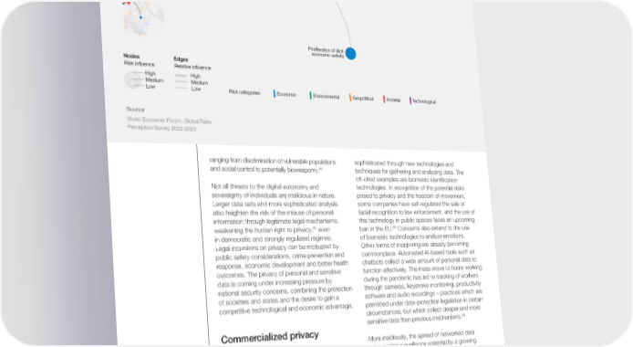 FIGURE 2.9 Risk interconnections: cyber insecurity Adverse outcomes Widespread cybercrime of frontier technologies and cyber insecurity Digital power concentration Interstate conflict Digital inequality Terrorist attacks Misinformation and Breakdown of critical disinformation information infrastructure Reference Proliferation of illicit economic activity Nodes EdgesEdges Risk influence Relative influence High High Medium Medium Low Low Risk categories Economic Environmental Geopolitical Societal Technological Source World Economic Forum, Global Risks Perception Survey 2022-2023. ranging from discrimination of vulnerable populations sophisticated through new technologies and 84 and social control to potentially bioweaponry. techniques for gathering and analyzing data. The oft-cited examples are biometric identi昀椀cation Not all threats to the digital autonomy and technologies. In recognition of the potential risks sovereignty of individuals are malicious in nature. posed to privacy and the freedom of movement, Larger data sets and more sophisticated analysis some companies have self-regulated the sale of also heighten the risk of the misuse of personal facial recognition to law enforcement, and the use of information through legitimate legal mechanisms, this technology in public spaces faces an upcoming 85 88 weakening the human right to privacy, even ban in the EU. Concerns also extend to the use in democratic and strongly regulated regimes. of biometric technologies to analyze emotions. Legal incursions on privacy can be motivated by Other forms of monitoring are already becoming public safety considerations, crime prevention and commonplace. Automated AI-based tools such as response, economic development and better health chatbots collect a wide amount of personal data to outcomes. The privacy of personal and sensitive function effectively. The mass move to home working data is coming under increasing pressure by during the pandemic has led to tracking of workers national security concerns, combining the protection through cameras, keystroke monitoring, productivity of societies and states and the desire to gain a software and audio recordings – practices which are competitive technological and economic advantage. permitted under data-protection legislation in certain circumstances, but which collect deeper and more 89 sensitive data than previous mechanisms. Commercialized privacy More insidiously, the spread of networked data is increasing surveillance potential by a growing The right to privacy as it applies to information about number of both public- and private-sector actors, 90 individuals incorporates two key elements: the right despite stringent regulatory protection. As our not to be observed and the right to control the 昀氀ow lives become increasingly digitalized over the 86 of information when observed. As more data is next decade, our “everyday experience” will be collected and the power of emerging technologies recorded and commodi昀椀ed through internet-enabled increases over the next decade, individuals will be devices, more intelligent infrastructure and “smart” targeted and monitored by the public and private cities – a passive, pervasive and persistent form of sector to an unprecedented degree, often without networked observations that are already being used 87 91 adequate anonymity or consent. to create targeted pro昀椀les. This pattern will only be enhanced by the metaverse, which could collect Surveillance technologies are becoming increasingly and track even more sensitive data, including facial Global Risks Report 2023 43