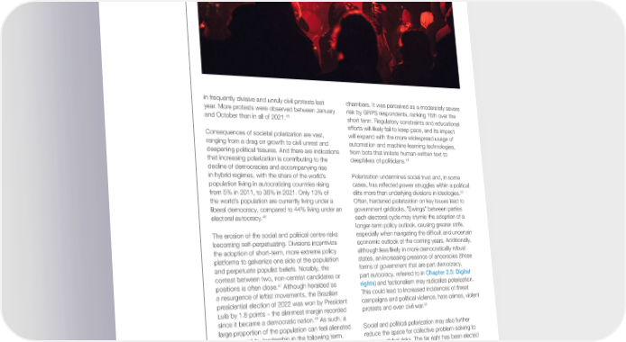 in frequently divisive and unruly civil protests last chambers. It was perceived as a moderately severe year. More protests were observed between January risk by GRPS respondents, ranking 16th over the 45 and October than in all of 2021. short term. Regulatory constraints and educational efforts will likely fail to keep pace, and its impact Consequences of societal polarization are vast, will expand with the more widespread usage of ranging from a drag on growth to civil unrest and automation and machine-learning technologies, deepening political 昀椀ssures. And there are indications from bots that imitate human-written text to that increasing polarization is contributing to the deepfakes of politicians.51 decline of democracies and accompanying rise in hybrid regimes, with the share of the world’s Polarization undermines social trust and, in some population living in autocratizing countries rising cases, has re昀氀ected power struggles within a political 52 from 5% in 2011, to 36% in 2021. Only 13% of elite more than underlying divisions in ideologies. the world’s population are currently living under a Often, hardened polarization on key issues lead to liberal democracy, compared to 44% living under an government gridlocks. "Swings" between parties 46 electoral autocracy. each electoral cycle may stymie the adoption of a longer-term policy outlook, causing greater strife, The erosion of the social and political centre risks especially when navigating the dif昀椀cult and uncertain becoming self-perpetuating. Divisions incentivize economic outlook of the coming years. Additionally, the adoption of short-term, more extreme policy although less likely in more democratically robust platforms to galvanize one side of the population states, an increasing presence of anocracies (those and perpetuate populist beliefs. Notably, the forms of government that are part democracy, contest between two, non-centrist candidates or part autocracy, referred to in Chapter 2.5: Digital 47 positions is often close. Although heralded as rights) and factionalism may radicalize polarization. a resurgence of leftist movements, the Brazilian This could lead to increased incidences of threat presidential election of 2022 was won by President campaigns and political violence, hate crimes, violent Lula by 1.8 points – the slimmest margin recorded protests and even civil war.53 48 since it became a democratic nation. As such, a large proportion of the population can feel alienated Social and political polarization may also further and angered by leadership in the following term, reduce the space for collective problem-solving to acting as a multiplier to existing societal concerns address global risks. The far right has been elected and civil unrest. This is further ampli昀椀ed by social in Italy and are now the second largest party in media, which increases polarization and distrust in Sweden, while the left has resurged in Latin America. 49 institutions alongside political engagement. National elections will take place in several G20 countries within the next two years, including the “Misinformation and disinformation” are, United States of America, South Africa, Türkiye, together, a potential accelerant to the erosion of Argentina, Mexico and Indonesia. The election of social cohesion as well as a consequence. With less-centrist leaders and adoption of more “extreme” the potential to destabilize trust in information and policies in economic superpowers may fracture 50 political processes, it has become a prominent tool alliances, limit global collaboration and lead to a for geopolitical agents to propagate extremist beliefs more volatile dynamic. and sway elections through social media echo Global Risks Report 2023 24