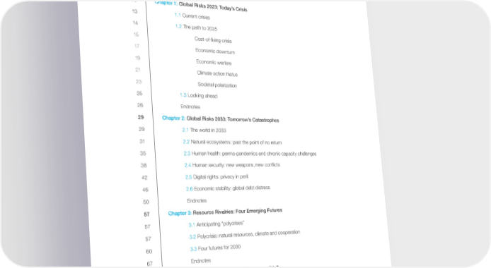 January 2023 Global Risks Report 2023 Contents 4 Preface 5 Overview of Methodology 6 Executive Summary 13 Chapter 1: Global Risks 2023: Today’s Crisis 13 1.1 Current crises 14 1.2 The path to 2025 15 Cost-of-living crisis 17 Economic downturn 19 Economic warfare 21 Climate action hiatus 23 Societal polarization 25 1.3 Looking ahead 26 Endnotes 29 Chapter 2: Global Risks 2033: Tomorrow’s Catastrophes 29 2.1 The world in 2033 31 2.2 Natural ecosystems: past the point of no return 35 2.3 Human health: perma-pandemics and chronic capacity challenges 38 2.4 Human security: new weapons, new con昀氀icts 42 2.5 Digital rights: privacy in peril 46 2.6 Economic stability: global debt distress 50 Endnotes 57 Chapter 3: Resource Rivalries: Four Emerging Futures 57 3.1 Anticipating “polycrises” 57 3.2 Polycrisis: natural resources, climate and cooperation 60 3.3 Four futures for 2030 67 Endnotes 69 Chapter 4: Conclusion: is preparedness possible? 73 Endnotes 74 Appendix A – Technical Notes: Global Risks Perception Survey 2022-2023 79 Appendix B – Executive Opinion Survey: National Risk Perceptions 96 Acknowledgements © 2023 World Economic Forum. All rights reserved. No part of this publication may be reproduced or transmitted in any form or by any means, including photocopying and recording, or by any information storage and retrieval system. Global Risks Report 2023 3