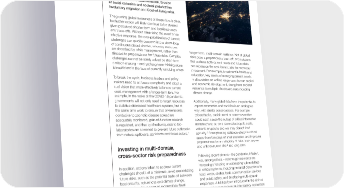 and private sector alike. For better planning and preparedness, institutions must de-anchor risk prioritization from shorter-term incentives. Despite regularly featuring in the top rankings, the most severe global risks – pertaining particularly to climate and nature – are those we are still the least prepared for. The majority of GRPS respondents assessed existing measures to prevent or prepare for the Failure to mitigate climate change, Failure of climate-change adaptation, and Biodiversity loss and ecosystem collapse as ineffective or highly ineffective (Figure 4.1). Similarly, most respondents considered preparedness to be inadequate for Misinformation and disinformation, Erosion of social cohesion and societal polarization, Involuntary migration and Cost-of-living crisis. The growing global awareness of these risks is clear, but further action will likely continue to be stymied, given perceived shorter-term and localized crises and trade-offs. Without minimizing the need for an effective response, the over-prioritization of current challenges can quickly descend into a doom-loop of continuous global shocks, whereby resources are absorbed by crisis management, rather than longer-term, multi-domain resilience. Not all global directed to preparedness for future risks. Complex risks pose a preparedness trade-off, and solutions challenges cannot be solely solved by short-term that address both current needs and future risks decision-making – and yet long-term thinking alone can rebalance the cost-bene昀椀t ratio for necessary is insuf昀椀cient in the face of currently unfolding crises. investment. For example, investment in health and education, key tenets of managing present needs To break the cycle, business leaders and policy- in all societies as well as longer-term human capital makers need to embrace complexity and adopt a and economic development, strengthens societal dual vision that more effectively balances current resilience to multiple shocks and risks including crisis management with a longer-term lens. For climate change. example, in the wake of the COVID-19 pandemic, governments will not only need to target resources Additionally, many global risks have the potential to to stabilize distressed healthcare systems, but at impact economies and societies in an analogous the same time work to ensure that environments way, with similar consequences. For example, conducive to zoonotic disease spread are cyberattacks, social unrest or extreme weather adequately monitored, gain-of-function research could each cause the outage of critical information is regulated, and that synthesis requests to bio- infrastructure; or, on a more catastrophic scale, laboratories are screened to prevent future outbreaks volcanic eruptions and war may disrupt food 4 5 from natural spillovers, accidents and threat actors. security. Strengthening resilience efforts in critical areas therefore pays off in all scenarios and improves preparedness for a multiplicity of risks, both known Investing in multi-domain, and unknown, and short and long term. cross-sector risk preparedness Following recent shocks – the pandemic, in昀氀ation, war, among others – national governments are In addition, actions taken to address current increasingly focusing on addressing vulnerabilities challenges should, at a minimum, avoid exacerbating in critical systems, including potential disruptions to future risks, such as the potential trade-off between food, water, shelter, basic communication services food security, nature loss and climate change. and public safety, and developing multi-domain Recent crises have seen an extraordinary level responses. A bill has been introduced in the United of 昀椀scal intervention to protect individuals and States of America to form an interagency committee companies from the 昀椀nancial impacts of crises – to assess all global catastrophic risks over the next from the COVID-19 pandemic to energy prices. 30 years and develop strategies to ensure continuity While necessary and perhaps unavoidable in the of operations and critical infrastructure if these risks 6 circumstances at hand, it remains to be seen how arise. In addition, the UK Government is developing signi昀椀cantly these rapid, large-scale actions will a tool to measure socioeconomic resilience to key result in debt sustainability concerns and how widely civil contingencies risks, to provide a more nuanced, they distracted decision-makers from other risks data-driven view on how risks impact across different highlighted in this report. communities and groups.7 Conversely, many shorter-term actions can also act As global risks become more intertwined, as wider stabilizers, embedding and accelerating preparedness also needs to become more of a Global Risks Report 2023 71