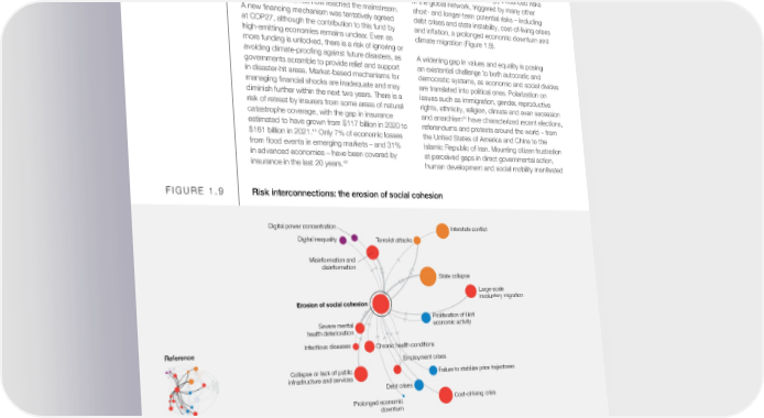 Nor do new investments in infrastructure or capital Societal polarization allocation decisions adequately consider current and future risks. Investors and policy-makers are locking themselves into costly futures, likely to be borne “Erosion of social cohesion and societal by the most vulnerable. Disagreements on what polarisation” has been climbing in the ranks of constitutes adaptation, and the lack of shared goals perceived severity in recent years.43 De昀椀ned as the and best practices, robust regulatory frameworks loss of social capital and fracturing of communities and metrics, add to a high risk of overshooting and leading to declining social stability, individual and undershooting adaptation efforts. collective wellbeing and economic productivity, it ranked as the 昀椀fth-most severe global risk faced in Limits to adaptation are also increasingly evident. the short term by GRPS respondents. It was also This has been highlighted by the Loss and Damage seen as one of the most strongly in昀氀uenced risks agenda which, after decades on the sidelines of the in the global network, triggered by many other climate discourse, has now reached the mainstream. short- and longer-term potential risks – including A new 昀椀nancing mechanism was tentatively agreed debt crises and state instability, cost-of-living crises at COP27, although the contribution to this fund by and in昀氀ation, a prolonged economic downturn and high-emitting economies remains unclear. Even as climate migration (Figure 1.9). more funding is unlocked, there is a risk of ignoring or avoiding climate-proo昀椀ng against future disasters, as A widening gap in values and equality is posing governments scramble to provide relief and support an existential challenge to both autocratic and in disaster-hit areas. Market-based mechanisms for democratic systems, as economic and social divides managing 昀椀nancial shocks are inadequate and may are translated into political ones. Polarization on diminish further within the next two years. There is a issues such as immigration, gender, reproductive risk of retreat by insurers from some areas of natural rights, ethnicity, religion, climate and even secession catastrophe coverage, with the gap in insurance and anarchism44 have characterized recent elections, estimated to have grown from $117 billion in 2020 to referendums and protests around the world – from 41 $161 billion in 2021. Only 7% of economic losses the United States of America and China to the from 昀氀ood events in emerging markets – and 31% Islamic Republic of Iran. Mounting citizen frustration in advanced economies – have been covered by at perceived gaps in direct governmental action, 42 insurance in the last 20 years. human development and social mobility manifested FIGURE 1.9 Risk interconnections: the erosion of social cohesion Digital power concentration Interstate conflict Digital inequality Terrorist attacks Misinformation and disinformation State collapse Large-scale Erosion of social cohesion involuntary migration Proliferation of illicit Severe mental economic activity health deterioration Reference Infectious diseases Chronic health conditions Employment crises Collapse or lack of public Failure to stabilize price trajectories infrastructure and services Debt crises Prolonged economic Cost-of-living crisis downturn Nodes EdgesEdges Risk influence Relative influence High High Medium Medium Low Low Risk categories Economic Environmental Geopolitical Societal Technological Source World Economic Forum, Global Risks Perception Survey 2022-2023. Global Risks Report 2023 23