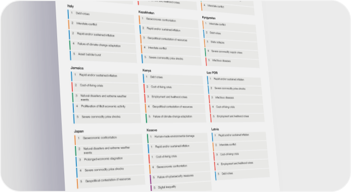 TABLE B.2 Top five risks identified by the Executive Opinion Survey (EOS) Israel Jordan Kuwait 1 Cost-of-living crisis 1 Debt crises 1 Rapid and/or sustained inflation 2 Terrorist attacks 2 Severe commodity supply crises 1 Cost-of-living crisis 3 Interstate conflict 2 Cost-of-living crisis 3 Severe commodity price shocks 4 Geoeconomic confrontation 4 Severe commodity price shocks 4 Human-made environmental damage 5 Asset bubble burst 5 Employment and livelihood crises 4 Interstate conflict Italy Kazakhstan Kyrgyzstan 1 Debt crises 1 Geoeconomic confrontation 1 Interstate conflict 2 Interstate conflict 2 Rapid and/or sustained inflation 2 Debt crises 2 Rapid and/or sustained inflation 3 Geopolitical contestation of resources 3 State collapse 4 Failure of climate-change adaptation 4 Interstate conflict 4 Severe commodity supply crises 5 Asset bubble burst 5 Severe commodity price shocks 5 Infectious diseases Jamaica Kenya Lao PDR 1 Rapid and/or sustained inflation 1 Debt crises 1 Rapid and/or sustained inflation 2 Cost-of-living crisis 2 Cost-of-living crisis 2 Severe commodity price shocks 3 Natural disasters and extreme weather 3 Employment and livelihood crises 3 Infectious diseases events 4 Proliferation of illicit economic activity 4 Geopolitical contestation of resources 4 Cost-of-living crisis 5 Severe commodity price shocks 5 Failure of climate-change adaptation 5 Employment and livelihood crises Japan Kosovo Latvia 1 Geoeconomic confrontation 1 Human-made environmental damage 1 Rapid and/or sustained inflation 2 Natural disasters and extreme weather 1 Rapid and/or sustained inflation 2 Interstate conflict events 3 Prolonged economic stagnation 1 Cost-of-living crisis 3 Cost-of-living crisis 4 Severe commodity price shocks 4 Geoeconomic confrontation 4 Employment and livelihood crises 5 Geopolitical contestation of resources 5 Failure of cybersecurity measures 5 Debt crises 5 Digital inequality Risk categories Economic Environmental Geopolitical Societal Technological Global Risks Report 2023 84