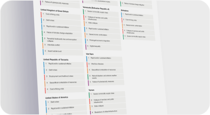 TABLE B.2 Top five risks identified by the Executive Opinion Survey (EOS) United Arab Emirates Uruguay Zambia 1 Cost-of-living crisis 1 Severe commodity price shocks 1 Debt crises 2 Rapid and/or sustained inflation 2 Rapid and/or sustained inflation 2 Cost-of-living crisis 3 Severe commodity price shocks 3 Prolonged economic stagnation 3 Failure of climate-change adaptation 4 Geopolitical contestation of resources 3 Cost-of-living crisis 4 Geopolitical contestation of resources 5 Geoeconomic confrontation 5 Automation and displacement of jobs 5 Failure of climate-change mitigation 5 Failure of cybersecurity measures Venezuela (Bolivarian Republic of) Zimbabwe 1 Severe commodity supply crises 1 Rapid and/or sustained inflation United Kingdom of Great Britain 1 Cost-of-living crisis 2 Collapse of services and public 2 Cost-of-living crisis infrastructure 2 Debt crises 3 State collapse 3 Geoeconomic confrontation 3 Rapid and/or sustained inflation 3 Rapid and/or sustained inflation 4 Collapse of services and public infrastructure 4 Failure of climate-change adaptation 5 Geoeconomic confrontation 5 Severe commodity supply crises 5 Terrestrial biodiversity loss and ecosystem 5 Prolonged economic stagnation collapse 5 Interstate conflict 5 Digital inequality 5 Asset bubble burst Viet Nam 1 Rapid and/or sustained inflation United Republic of Tanzania 1 Rapid and/or sustained inflation 2 Infectious diseases 2 Debt crises 3 Geopolitical contestation of resources 3 Employment and livelihood crises 4 Natural disasters and extreme weather events 4 Geopolitical contestation of resources 5 Failure of cybersecurity measures 4 Cost-of-living crisis Yemen 1 Severe commodity supply crises United States of America 1 Debt crises 2 Collapse of services and public infrastructure 2 Rapid and/or sustained inflation 3 State collapse 3 Geoeconomic confrontation 4 Breakdown of critical infrastructure 4 Cost-of-living crisis 5 Proliferation of illicit economic activity 5 Failure of climate-change adaptation Risk categories Economic Environmental Geopolitical Societal Technological Global Risks Report 2023 89