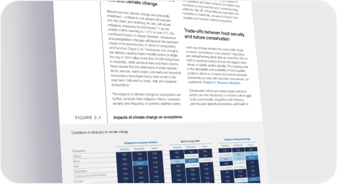 Terrestrial and marine ecosystems are facing and other natural disasters are already degrading multiple pressure points due to their undervalued nature-based solutions to climate change, such contribution to the global economy as well as overall as wild昀椀res in forests used for carbon offsetting.7 planetary health. While not the sole drivers, at the In addition, a variety of ecosystems are at risk of heart of this potential catastrophe are key trade- tipping over into self-perpetuating and irreversible offs and feedback mechanisms emerging from change that will accelerate and compound the current crises. Without signi昀椀cant policy change or impacts of climate change. Continued damage to investments, the complex linkages between climate carbon sinks through deforestation and permafrost change mitigation, food insecurity and biodiversity thaw, for example, and a decline in carbon storage degradation will accelerate ecosystem collapse. productivity (soils and the ocean) may turn these ecosystems into “natural” sources of carbon and 8 methane emissions. The impending collapse of Exponentially accelerating nature the Greenland and West Antarctic ice sheets may loss and climate change contribute to sea-level rise and coastal 昀氀ooding, while the “die-off” of low-latitude coral reefs, the nurseries of marine life, are sure to impact food Nature loss and climate change are intrinsically supplies and broader marine ecosystems. interlinked – a failure in one sphere will cascade into the other, and attaining net zero will require 2 mitigatory measures for both levers. If we are Trade-offs between food security unable to limit warming to 1.5°C or even 2°C, the and nature conservation continued impact of natural disasters, temperature and precipitation changes will become the dominant cause of biodiversity loss, in terms of composition Land-use change remains the most proli昀椀c threat and function (Figure 2.4).3 Heatwaves and droughts to nature, according to many experts.9 Agriculture are already causing mass mortality events (a single and animal farming alone take up more than 35% of hot day in 2014 killed more than 45,000 昀氀ying foxes Earth's terrestrial surface and are the biggest direct in Australia), while sea level rises and heavy storms drivers of wildlife decline globally. The ongoing crisis 4 have caused the 昀椀rst extinctions of entire species. in the affordability and availability of food supplies Arctic sea-ice, warm-water coral reefs and terrestrial positions efforts to conserve and restore terrestrial ecosystems have been found most at risk in the biodiversity at odds with domestic food security, as near term, followed by forest, kelp and seagrass explored in Chapter 3: Resource Rivalries. 5 ecosystems. Conservation efforts and nature-based solutions The impacts of climate change on ecosystems can (which can offer biodiversity co-bene昀椀ts) will struggle further constrain their mitigation effects. Increased to be commercially competitive with intensive, severity and frequency of extreme weather events yield-focused agricultural practices, particularly in FIGURE 2.4 Impacts of climate change on ecosystems Confidence in attribution to climate change Changes in ecosystem structure Species range shifts Changes in timing (phenology) Ecosystems Terrestrial Freshwater Ocean Terrestrial Freshwater Ocean Terrestrial Freshwater Ocean Global High High High High High High High High High Africa High High High High Lim. evidence High Lim. evidence Low Low Asia High Medium High Low Medium Lim. evidence Low Low Medium Australasia High High High High Lim. evidence High High Lim. evidence Low Central and South America High High High High High High Lim. evidence Lim. evidence Low Europe High High High High High High High High High North America High High High High High High High High High Small Islands High High High High High High High Lim. evidence Medium Arctic High Medium High High High High High Medium High Antarctic Medium Lim. evidence Medium Medium Lim. evidence Medium Medium Lim. evidence Lim. evidence Mediterrean region High Lim. evidence High High Medium High High Lim. evidence Medium Tropical forest High Lim. evidence N/A Medium Lim. evidence N/A Lim. evidence Lim. evidence N/A Mountain regions High High N/A High Medium N/A High Low N/A Deserts High N/A N/A High N/A N/A Lim. evidence N/A N/A Biodiversity hotspots High Lim. evidence High High Lim. evidence High High Lim. evidence Not assessed Source 6 IPCC, 2022. Global Risks Report 2023 32