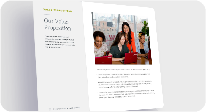 33 GLOBALGIVING BRAND GUIDE Our Value Proposition VALUE PROPOSITION • GlobalGiving is a top-rated nonprofit on a mission to accelerate community-led change. • GlobalGiving makes it possible [optional: for you/for companies/for anyone] to give to [local, vetted] nonprofits anywhere in the world. • GlobalGiving makes it possible for you to give to local organizations that are working to educate children, feed the hungry, build houses, train women (and men) with job skills, and do hundreds of other amazing things all around the world. • GlobalGiving connects nonprofits, donors, and companies in nearly every country around the world. We make it possible for local organizations to access the funding, tools, training, and support they need to make our world a better place. These are several descriptions of GlobalGiving that help convey our value to our many audiences. You’ll find them in various forms throughout our website and communications.