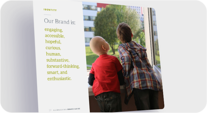 GlobalGiving Brand Book Page 28 Page 3029 GLOBALGIVING BRAND GUIDE Our Brand is: engaging, accessible, hopeful, curious, human, substantive, forward-thinking, smart, and enthusiastic. IDENTITY