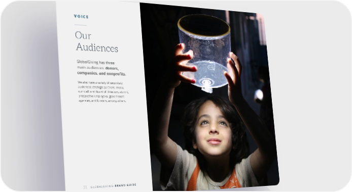 31 GLOBALGIVING BRAND GUIDE Our Audiences GlobalGiving has three main audiences: donors, companies, and nonprofits. We also have a variety of secondary audiences: strategic partners, media, our staff and Board of Directors, alumni, prospective employees, government agencies, and funders, among others. VOICE