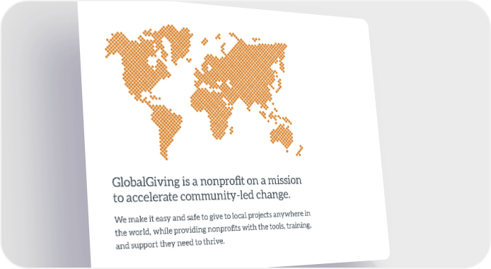 GlobalGiving is a nonprofit on a mission to accelerate community-led change. We make it easy and safe to give to local projects anywhere in the world, while providing nonprofits with the tools, training, and support they need to thrive.