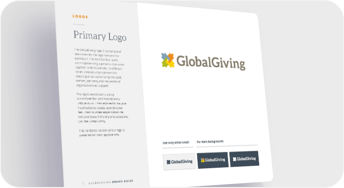 5 GLOBALGIVING BRAND GUIDE Primary Logo The GlobalGiving logo is comprised of two elements: the logo icon and the wordmark. The icon has four parts— each representing a person—that come together to form a whole. Its different colors conceptually represent the diversity of our community: the staff, donors, partners, and thousands of organizations we support. The logo’s wordmark is a fully customized font and is completely unique to us. It has mild serifs that give it a structured, classic, sophisticated feel. Their rounded edges soften the font and make it friendly and accessible, just like GlobalGiving. This horizontal version of our logo is preferred for most applications. For dark backgrounds LOGOS Use only when small
