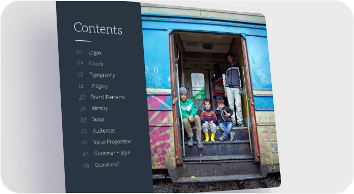GlobalGiving Brand Book Page 1 Page 3Logos Colors Typography Imagery Brand Elements Identity Voice Audiences Value Proposition Grammar + Style Questions? 04 09 12 15 20 26 32 35 41 44 48 Contents