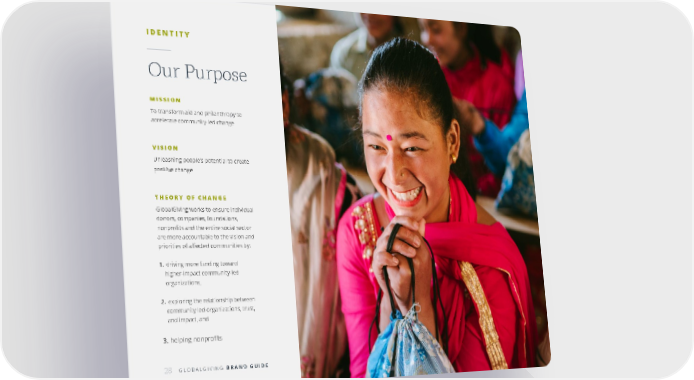 28 GLOBALGIVING BRAND GUIDE Our Purpose MISSION To transform aid and philanthropy to accelerate community-led change VISION Unleashing people’s potential to create positive change THEORY OF CHANGE GlobalGiving works to ensure individual donors, companies, foundations, nonprofits and the entire social sector are more accountable to the vision and priorities of affected communities by: 1. driving more funding toward higher-impact community-led organizations, 2. exploring the relationship between community led organizations, trust, and impact, and 3. helping nonprofits IDENTITY