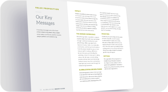 34 GLOBALGIVING BRAND GUIDE Our Key Messages VALUE PROPOSITION IMPACT GlobalGiving believes communities belong in the driver’s seat of change. This means we work to create a future where nonprofits are accountable first and foremost to the communities they serve; donors trust that communities know best; and social change leaders have access to flexible funding, which they are able to spend in whatever way best serves their communities. THE DONOR EXPERIENCE GlobalGiving makes it possible to support creative ideas that might never be funded through traditional development and philanthropy. Select a project that’s important to you, make a tax-deductible contribution, and then get email updates from the project leaders so you can see how your gift is making a difference. But just because you’re funding the underdog, it doesn’t mean you’re taking undue risk. We have a tested vetting process, and we make sure donors get feedback about how their contributions have been put to work and through the GlobalGiving Guarantee. GLOBALGIVING-DRIVEN FUNDS GlobalGiving typically drives millions per year to our partners in the form of matching funds, corporate partner donations, bonus rewards, gift card redemptions, and as a result of our marketing and fundraising efforts. 97% of our partners benefit from these funds. When you account for all the extra funding that GlobalGiving delivers, GlobalGiving is essentially free for our typical partner. Most nonprofits experience a 0% net fee on GlobalGiving. That means the benefits of using GlobalGiving—access to tools, training, one-on-one support, our trusted platform, and our extra funding—literally pay for themselves. DISASTERS GlobalGiving has partnerships with thousands of trusted nonprofits around the world, so when disasters happen, we can safely and quickly deliver funds to community-led organizations that are best-suited to provide relief. Since 2004, we’ve been shifting decision- making power to crises-affected communities through our unique model of trust-based grantmaking and support. VETTING The organizations that post projects on GlobalGiving go through our rigorous due diligence review, satisfy US and UK government guidelines for international grantmaking and tax deductibility, and meet anti-terrorism requirements. These key messages are at the heart of the GlobalGiving brand; they explain what makes us different and the reasons people partner with GlobalGiving.