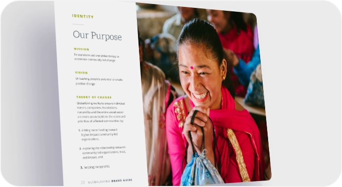 28 GLOBALGIVING BRAND GUIDE Our Purpose MISSION To transform aid and philanthropy to accelerate community-led change VISION Unleashing people’s potential to create positive change THEORY OF CHANGE GlobalGiving works to ensure individual donors, companies, foundations, nonprofits and the entire social sector are more accountable to the vision and priorities of affected communities by: 1. driving more funding toward higher-impact community-led organizations, 2. exploring the relationship between community led organizations, trust, and impact, and 3. helping nonprofits IDENTITY