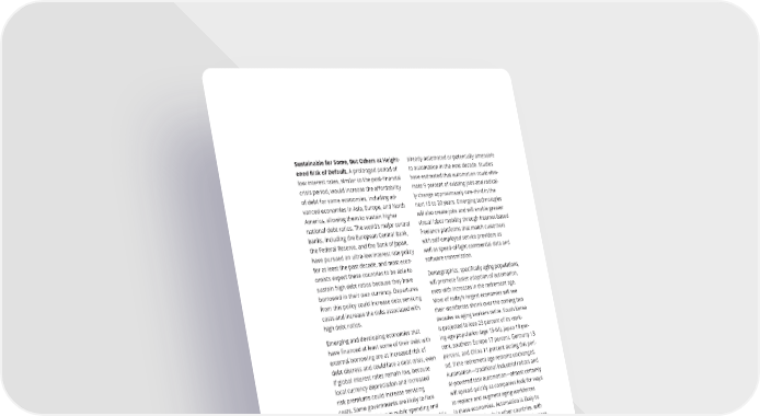 Sustainable for Some, But Others at Height- already automated or potentially amenable ened Risk of Default. A prolonged period of to automation in the next decade. Studies low interest rates, similar to the post-昀椀nancial have estimated that automation could elim- crisis period, would increase the a昀昀ordability inate 9 percent of existing jobs and radical- of debt for some economies, including ad- ly change approximately one-third in the vanced economies in Asia, Europe, and North next 15 to 20 years. Emerging technologies America, allowing them to sustain higher will also create jobs and will enable greater national debt ratios. The world’s major central virtual labor mobility through Internet-based banks, including the European Central Bank, freelance platforms that match customers the Federal Reserve, and the Bank of Japan, with self-employed service providers as have pursued an ultra-low interest rate policy well as speed-of-light commercial data and for at least the past decade, and most econ- software transmission. omists expect these countries to be able to sustain high debt ratios because they have Demographics, speci昀椀cally aging populations, borrowed in their own currency. Departures will promote faster adoption of automation, from this policy could increase debt servicing even with increases in the retirement age. costs and increase the risks associated with Most of today’s largest economies will see high debt ratios. their workforces shrink over the coming two decades as aging workers retire. South Korea Emerging and developing economies that is projected to lose 23 percent of its work- have 昀椀nanced at least some of their debt with ing-age population (age 15-64), Japan 19 per- external borrowing are at increased risk of cent, southern Europe 17 percent, Germany 13 debt distress and could face a debt crisis, even percent, and China 11 percent during this peri- if global interest rates remain low, because od, if the retirement age remains unchanged. local currency depreciation and increased Automation—traditional industrial robots and risk premiums could increase servicing AI-powered task automation—almost certainly costs. Some governments are likely to face will spread quickly as companies look for ways the choice of reining in public spending and to replace and augment aging workforces risking public discontent, or maintaining public in these economies. Automation is likely to spending, which would further increase debt spread more slowly in other countries, with burdens and borrowing costs and risk local the key being whether it o昀昀ers cost advantag- currency depreciation. Facing these choices, es, including over low-skilled labor. some governments are likely to prioritize The number of jobs created by new technolo- spending on domestic issues rather than the gies is likely to surpass those destroyed during global commons. the next 20 years, judging from past episodes. DISRUPTIONS IN EMPLOYMENT One study by the World Economic Forum The global employment landscape will con- estimates that by 2025, automation will have tinue to shift because of new technologies, created 97 million new jobs and displaced 85 notably automation, online collaboration tools, million existing jobs. Several factors, including arti昀椀cial intelligence (AI), and perhaps addi- skills, 昀氀exibility, demographic factors, underly- tive manufacturing. Tasks that once seemed ing wages, the share of jobs susceptible to au- uniquely suited to human abilities, such as tomation, and access to continuing education driving a car or diagnosing a disease, are could in昀氀uence how well individual countries 46 GLOBAL TRENDS 2040