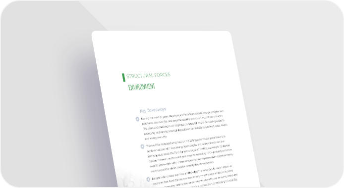 STRUCTURAL FORCES ENVIRONMENT Key Takeaways During the next 20 years, the physical effects from climate change of higher tem- peratures, sea level rise, and extreme weather events will impact every country. The costs and challenges will disproportionately fall on the developing world, in- tersecting with environmental degradation to intensify risks to food, water, health, and energy security. There will be increased emphasis on mitigating greenhouse gas emissions to achieve net zero with new energy technologies and carbon dioxide removal techniques to meet the Paris Agreement goal of limiting warming to 1.5 degrees Celsius. However, as the world gets closer to exceeding 1.5°C—probably within the next 20 years—calls will increase for geoengineering research and possible deploy- ment to cool the planet, despite possibly dire consequences. Debate will increase over how and how fast the world should reach net zero as countries face hard choices over how to implement drastic emissions cuts and adaptive measures. Neither the burdens nor the bene昀椀ts will be evenly distributed within or between countries, heightening competition, contributing to instability, straining military readiness, and encouraging political discord. 30 Photo / Pexels