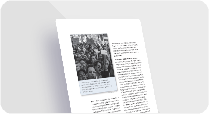 most extreme cases, violence, internal con- 昀氀ict, or even state collapse. Variations in state capacity, ideology, and prior histories with mobilization will shape how and when public discontent translates into political volatility in each country. Polarization and Populism. Polarization along ethnic, religious, and ideological lines is likely to remain strong, as political leaders and well-organized groups push a wide variety of broad goals and approaches that cut across economic, governance, social, identity, and international issues. In some countries, such Protests—seen here in Algeria—have surged polarization is likely to increase and reinforce political dysfunction and gridlock and heighten worldwide in the past decade, reflecting public risks of political instability. Once established, dissatisfaction on a range of topics including inequalities, political repression, corruption, and severe polarization is di昀케cult to reverse. Pub- climate change. lic dissatisfaction with mainstream politics for Amine M'Siouri / Pexels failing to address economic or social grievanc- es has also led to the global rise in populism during the past several decades—measured in Even if states improve security and welfare in both the number of populist leaders in power the aggregate, these gains and opportunities and populist party vote shares worldwide. may be unevenly distributed, fueling discon- Although some populists will falter in o昀케ce, tent in seemingly more prosperous societies. the populist appeal is likely to endure as long For instance, from 2000-2018, Organization as dissatisfaction, polarization, and fractured for Economic Cooperation and Development information landscapes persist. In addition, (OECD) countries experienced overall growth populism tends to surge after economic crises in employment, but jobs were divided be- or changes in the ethnic or religious composi- tween high and low wages with little in the tion of a society from migration. middle, many jobs became increasingly tenu- Protests. Anti-government protests have ous, and job growth varied signi昀椀cantly across regions and demographic groups. increased globally since 2010, a昀昀ecting every regime and government type. Although pro- POLITICAL VOLATILITY RISING tests are a signal of political turbulence, they In coming years, this mismatch between gov- can also be a sign of democratic health and a ernments’ abilities and publics’ expectations force for democratization by pressing for ac- is likely to expand and lead to more political countability and political change. The protest volatility, including growing polarization and phenomenon is likely to persist in cycles and populism within political systems, waves of waves because of the enduring nature of the activism and protest movements, and, in the underlying drivers, including ongoing public dissatisfaction and desire for systemic change, 82 GLOBAL TRENDS 2040