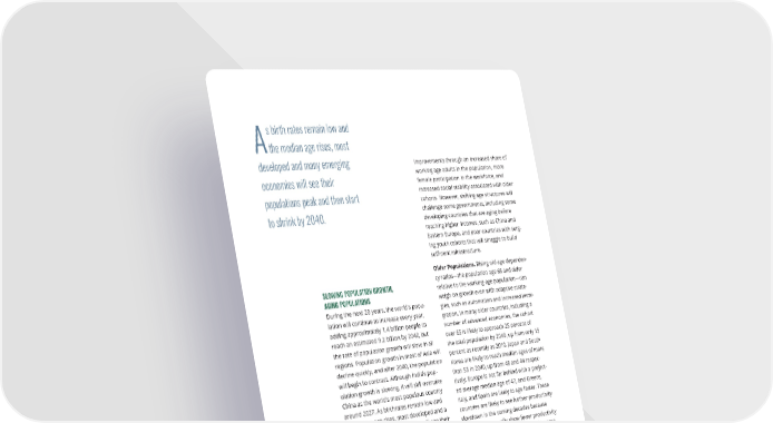 s birth rates remain low and Athe median age rises, most developed and many emerging improvements through an increased share of economies will see their working age adults in the population, more female participation in the workforce, and populations peak and then start increased social stability associated with older cohorts. However, shifting age structures will to shrink by 2040. challenge some governments, including some developing countries that are aging before reaching higher incomes, such as China and Eastern Europe, and poor countries with surg- ing youth cohorts that will struggle to build su昀케cient infrastructure. Older Populations. Rising old-age dependen- SLOWING POPULATION GROWTH, cy ratios—the population age 65 and older AGING POPULATIONS relative to the working-age population—can weigh on growth even with adaptive strate- During the next 20 years, the world’s popu- gies, such as automation and increased immi- lation will continue to increase every year, gration. In many older countries, including a adding approximately 1.4 billion people to number of advanced economies, the cohort reach an estimated 9.2 billion by 2040, but over 65 is likely to approach 25 percent of the rate of population growth will slow in all the total population by 2040, up from only 15 regions. Population growth in most of Asia will percent as recently as 2010. Japan and South decline quickly, and after 2040, the population Korea are likely to reach median ages of more will begin to contract. Although India’s pop- than 53 in 2040, up from 48 and 44 respec- ulation growth is slowing, it will still overtake tively. Europe is not far behind with a project- China as the world’s most populous country ed average median age of 47, and Greece, around 2027. As birthrates remain low and Italy, and Spain are likely to age faster. These the median age rises, most developed and a countries are likely to see further productivity handful of emerging economies will see their slowdown in the coming decades because populations peak and then start to shrink by older workers usually show fewer productivity 2040, including China, Japan, Russia, and many gains and a greater share of national income European countries. In contrast, Sub-Saha- will be diverted to pensions and health care ran Africa will account for around two-thirds for seniors. of global population growth and is poised to Working Age Populations. Countries with nearly double its current population by 2050, portending extensive strains on infrastructure, large working-age cohorts and relatively few education, and healthcare. young and old dependents have the potential for higher household savings that can be di- Aging: An Opportunity and a Burden rected to investment in human development. The combination of fewer children per woman During the next 20 years, South Asia, Latin and people living longer will see the global America, and the Middle East and North Africa population age rise from a median of about will be in this window of high working-age 31 years in 2020 to 35 in 2040. In middle-in- populations relative to below-working-age come countries, falling birthrates and older and retired dependents. Sixty-eight percent populations can facilitate human development of South Asia’s population will be of working 18 GLOBAL TRENDS 2040