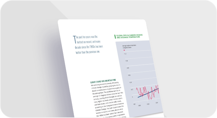 he past ten years was the GLOBAL RISE IN CARBON DIOXIDE Thottest on record, and every AND AVERAGE TEMPERATURE This graph illustrates the decade since the 1960s has been Average surface temperature Atmospheric CO2 concentrations change in global carbon dioxide in degrees Celsius in parts per million concentrations in atmospheric hotter than the previous one. parts per million and in global surface temperature in degrees +1.2 420 Celsius relative to pre-Industrial average temperatures. Nineteen of the 20 warmest years have +1.0 400 occurred since 2001, and 2020 tied TEMPERATURE for the hottest year on record. +0.8 380 +0.6 CARBON 360 CLIMATE CHANGE HERE AND INTENSIFYING DIOXIDE We are living in a world already a昀昀ected by +0.4 340 climate change caused by growing human-in- duced concentrations of greenhouse gases in the atmosphere. The world has warmed on +0.2 320 average 1.1 degrees Celsius since the late 19th century, causing diminished glaciers and ice caps, higher sea levels, more intense storms 0 300 and heat waves, and a more acidic ocean, according to the Intergovernmental Panel on Climate Change. The past 10 years were the -0.2 280 hottest on record, and every decade since 1880 1900 1920 1940 1960 1980 2000 2020 the 1960s has been hotter than the previ- ous one. On the current path, it is probable Source: NASA GISS, NOAA NCEI, ESRL. https://medialibrary.climatecentral.org/ that within the next 20 years global warming resources/national-and-global-emissions-sources-2020. will surpass 1.5°C while heading toward 2°C possibly by mid-century. Cumulative emis- sions already in the atmosphere will drive ronmental degradation, but the impact will temperature increases in the next two de- vary—some regions will even see some mar- cades even if emissions were to reach net zero ginal bene昀椀ts in the form of longer growing immediately, according to the US National seasons. In general, developing countries will Climate Assessment. su昀昀er more as they lack the capacity to adapt to climate change and on average are more Physical E昀昀ects highly exposed to its e昀昀ects. The physical e昀昀ects of a changing climate are likely to gradually intensify during the next two Melting Arctic and Sea Level Rise. Tempera- decades compared to the catastrophic impacts tures are warming at three times the global modeled for the latter half of the century, average in the Arctic largely as a result of feed- should temperature rise continue unabated. back loops from melting ice and snow cover. No country or region will be immune from the This has caused mass loss from ice sheets and physical e昀昀ects of climate change and envi- glaciers as well as reductions in sea ice extent 32 GLOBAL TRENDS 2040