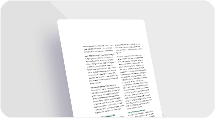 that are vector-borne (West Nile, malaria, Den- pledges to become carbon neutral—such as gue), waterborne (cholera), airborne (in昀氀uen- Chile, the European Union (EU), Japan, New za, hantavirus), and food-borne (salmonella). Zealand, and South Korea by 2050, and China Loss of Biodiversity. The variability among all by 2060. living organisms—known as biodiversity—is As climate modeling improves, divisions are declining faster than at any point in human likely to become more pronounced between history, risking food and health security and those who advocate reaching net zero emis- undermining global resilience. Warming sions over decades by transitioning to new temperatures are likely to lead to the extinc- technologies and those who argue that net tion of plants and animals that can no longer zero must be achieved more quickly to pre- survive in their traditional habitats or shift vent the worst outcomes. State pledges factor quickly to new locations as well as encourage in advancements in technologies to mitigate the spread of invasive species that choke out emissions while boosting economic growth native organisms. and assume that the worst e昀昀ects of climate Increased Migration. Extreme weather change can be avoided through a more events increase the risk of more environmen- gradual approach. Advocates of faster action tally-induced migration, which usually occurs argue that the window to avoid the cataclys- mic e昀昀ects is closing and that more dramatic, within states as a昀昀ected populations move immediate behavioral changes are required. to nearby communities, often temporarily. Limiting the global temperature increase to Climate change probably will exacerbate this as sea level rise or extreme heat makes certain 1.5°C will require unprecedented changes in locales permanently uninhabitable, although energy consumption and production to allow mainly after 2040, possibly causing permanent developing countries to grow their economies migration and movement to other states. while not o昀昀setting the carbon reductions from developed countries. MITIGATION GAINING TRACTION Energy Transition Underway E昀昀orts to set a path toward net zero green- A critical aspect of the global debate and the house gas emissions will intensify during the ability to mitigate climate change is the speed coming decade and spark increased debate of the transition from fossil fuels to renewable about how and how soon to achieve this goal. energy. Even though fossil fuels will continue The 2015 Paris Agreement set a global goal of to supply the majority of energy needs during limiting warming to less than 2°C, preferably the next 20 years, wind and solar are almost to 1.5°C, and resulted in countries volunteer- certain to grow faster than any other energy ing modest targets to reduce or establish a source because of technological advances and peak for their emissions. Although developed falling costs, and nuclear power production country emissions have continued to decline may grow, particularly if new, safer designs largely because of increased energy e昀케cien- emerge. Increasing energy e昀케ciencies proba- cy and use of natural gas, and the COVID-19 bly will also reduce the rate of energy demand pandemic also caused a brief drop in global growth and the carbon intensity per unit of en- emissions—overall emissions have continued ergy used. A range of current and future tech- to increase. This trend has led to a growing nological developments—as well as regulatory number of countries making more ambitious and investment choices by governments, 36 GLOBAL TRENDS 2040