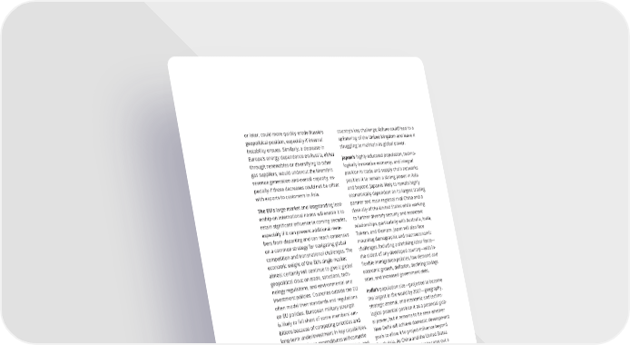 or later, could more quickly erode Russia’s country’s key challenge; failure could lead to a geopolitical position, especially if internal splintering of the United Kingdom and leave it instability ensues. Similarly, a decrease in struggling to maintain its global power. Europe’s energy dependence on Russia, either Japan’s highly educated population, techno- through renewables or diversifying to other logically innovative economy, and integral gas suppliers, would undercut the Kremlin’s position in trade and supply chain networks revenue generation and overall capacity, es- position it to remain a strong power in Asia pecially if those decreases could not be o昀昀set and beyond. Japan is likely to remain highly with exports to customers in Asia. economically dependent on its largest trading The EU’s large market and longstanding lead- partner and main regional rival China and a ership on international norms will enable it to close ally of the United States while working retain signi昀椀cant in昀氀uence in coming decades, to further diversify security and economic especially if it can prevent additional mem- relationships, particularly with Australia, India, bers from departing and can reach consensus Taiwan, and Vietnam. Japan will also face on a common strategy for navigating global mounting demographic and macroeconomic competition and transnational challenges. The challenges, including a shrinking labor force— economic weight of the EU’s single market the oldest of any developed country—with in- almost certainly will continue to give it global 昀氀exible immigration policies, low demand and geopolitical clout on trade, sanctions, tech- economic growth, de昀氀ation, declining savings nology regulations, and environmental and rates, and increased government debt. investment policies. Countries outside the EU India’s population size—projected to become often model their standards and regulations the largest in the world by 2027—geography, on EU policies. European military strength strategic arsenal, and economic and techno- is likely to fall short of some members’ am- logical potential position it as a potential glob- bitions because of competing priorities and al power, but it remains to be seen whether long-term underinvestment in key capabilities. New Delhi will achieve domestic development European defense expenditures will compete goals to allow it to project in昀氀uence beyond with other post–COVID-19 昀椀scal priorities, and South Asia. As China and the United States its security initiatives are unlikely to produce compete, India is likely to try to carve out a a military capability separate from the North more independent role. However, India may Atlantic Treaty Organization that can defend struggle to balance its long-term commit- against Russia. ment to strategic autonomy from Western The United Kingdom is likely to continue to powers with the need to embed itself more punch above its weight internationally given deeply into multilateral security architectures its strong military and 昀椀nancial sector and its to counter a rising China. India faces serious global focus. The United Kingdom’s nuclear ca- governance, societal, environmental, and pabilities and permanent UN Security Council defense challenges that constrain how much membership add to its global in昀氀uence. Man- it can invest in the military and diplomatic aging the economic and political challenges capabilities needed for a more assertive global posed by its departure from the EU will be the foreign policy. 96 GLOBAL TRENDS 2040