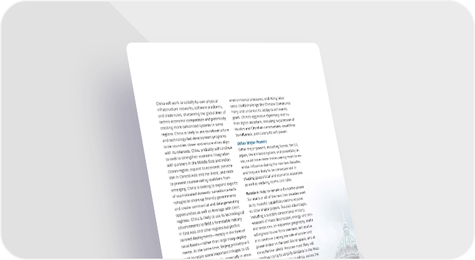 China will work to solidify its own physical environmental pressures, and rising labor infrastructure networks, software platforms, costs could challenge the Chinese Communist and trade rules, sharpening the global lines of Party and undercut its ability to achieve its techno-economic competition and potentially goals. China’s aggressive diplomacy and hu- creating more balkanized systems in some man rights violations, including suppression of regions. China is likely to use its infrastructure Muslim and Christian communities, could limit and technology-led development programs its in昀氀uence, particularly its soft power. to tie countries closer and ensure elites align with its interests. China probably will continue Other Major Powers to seek to strengthen economic integration Other major powers, including Russia, the EU, with partners in the Middle East and Indian Japan, the United Kingdom, and potentially In- Ocean region, expand its economic penetra- dia, could have more maneuvering room to ex- tion in Central Asia and the Arctic, and work ercise in昀氀uence during the next two decades, to prevent countervailing coalitions from and they are likely to be consequential in emerging. China is looking to expand exports shaping geopolitical and economic outcomes of sophisticated domestic surveillance tech- as well as evolving norms and rules. nologies to shore up friendly governments Russia is likely to remain a disruptive power and create commercial and data-generating for much or all of the next two decades even opportunities as well as leverage with client as its material capabilities decline relative regimes. China is likely to use its technological to other major players. Russia’s advantages, advancements to 昀椀eld a formidable military including a sizeable conventional military, in East Asia and other regions but prefers weapons of mass destruction, energy and min- tailored deployments—mostly in the form of eral resources, an expansive geography, and a naval bases—rather than large troop deploy- willingness to use force overseas, will enable ments. At the same time, Beijing probably will it to continue playing the role of spoiler and seek to retain some important linkages to US power broker in the post-Soviet space, and at and Western-led networks, especially in areas times farther a昀椀eld. Moscow most likely will of greater interdependence such as 昀椀nance continue trying to amplify divisions in the West and manufacturing. and to build relationships in Africa, across the China is likely to play a greater role in leading Middle East, and elsewhere. Russia probably responses to confronting global challenges will look for economic opportunity and to es- commensurate with its increasing power and tablish a dominant military position in the Arc- tic as more countries step up their presence in in昀氀uence, but Beijing will also expect to have the region. However, with a poor investment a greater say in prioritizing and shaping those climate, high reliance on commodities with responses in line with its interests. China potentially volatile prices, and a small econo- probably will look to other countries to o昀昀set the costs of tackling transnational challenges my—projected to be approximately 2 percent of global gross domestic product (GDP) for in part because Beijing faces growing domestic the next two decades—Russia may struggle to problems that will compete for attention and project and maintain in昀氀uence globally. Pres- resources. Potential 昀椀nancial crises, a rapidly ident Vladimir Putin’s departure from power, aging workforce, slowing productivity growth, either at the end of his current term in 2024 A MORE CONTESTED WORLD 95 Photos / Bigstock