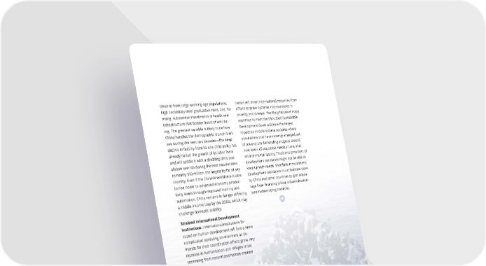 tinue to have large working-age populations, causes will divert international resources from high secondary-level graduation rates, and, for e昀昀orts to make systemic improvements in many, substantial investments in health and poverty and disease. The likely failure of many infrastructure that bolster levels of well-be- countries to meet the UN’s 2030 Sustainable ing. The greatest variable is likely to be how Development Goals will have the largest China handles the demographic crunch it will impact on middle-income societies where see during the next two decades—the deep populations that have recently emerged out decline in fertility from its one-child policy has of poverty are demanding progress toward already halted the growth of its labor force next levels of education, medical care, and and will saddle it with a doubling of its pop- environmental quality. Traditional providers of ulation over 65 during the next two decades development assistance might not be able to to nearly 350 million, the largest by far of any keep up with needs. Shortfalls in multilateral country. Even if the Chinese workforce is able development assistance could facilitate plans to rise closer to advanced-economy produc- by China and other countries to gain advan- tivity levels through improved training and tage from 昀椀nancing critical urban infrastruc- automation, China remains in danger of hitting ture in developing countries. a middle-income trap by the 2030s, which may challenge domestic stability. Strained International Development Institutions. International institutions fo- cused on human development will face a more complicated operating environment as de- mands for their coordination e昀昀orts grow. Any increase in humanitarian and refugee crises stemming from natural and human-created A MORE CONTESTED WORLD 29 Photo / Shutterstock