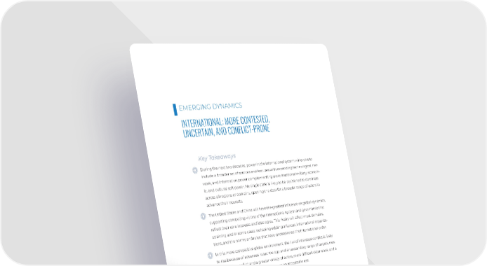 EMERGING DYNAMICS INTERNATIONAL: MORE CONTESTED, UNCERTAIN, AND CONFLICT-PRONE Key Takeaways During the next two decades, power in the international system will evolve to include a broader set of sources and features with expanding technological, net- work, and information power complementing more traditional military, econom- ic, and cultural soft power. No single state is likely to be positioned to dominate across all regions or domains, opening the door for a broader range of actors to advance their interests. The United States and China will have the greatest in昀氀uence on global dynamics, supporting competing visions of the international system and governance that re昀氀ect their core interests and ideologies. This rivalry will affect most domains, straining and in some cases reshaping existing alliances, international organiza- tions, and the norms and rules that have underpinned the international order. In this more competitive global environment, the risk of interstate con昀氀ict is likely to rise because of advances in technology and an expanding range of targets, new frontiers for con昀氀ict and a greater variety of actors, more dif昀椀cult deterrence, and a weakening or a lack of treaties and norms on acceptable use. 90 Photo / Bigstock